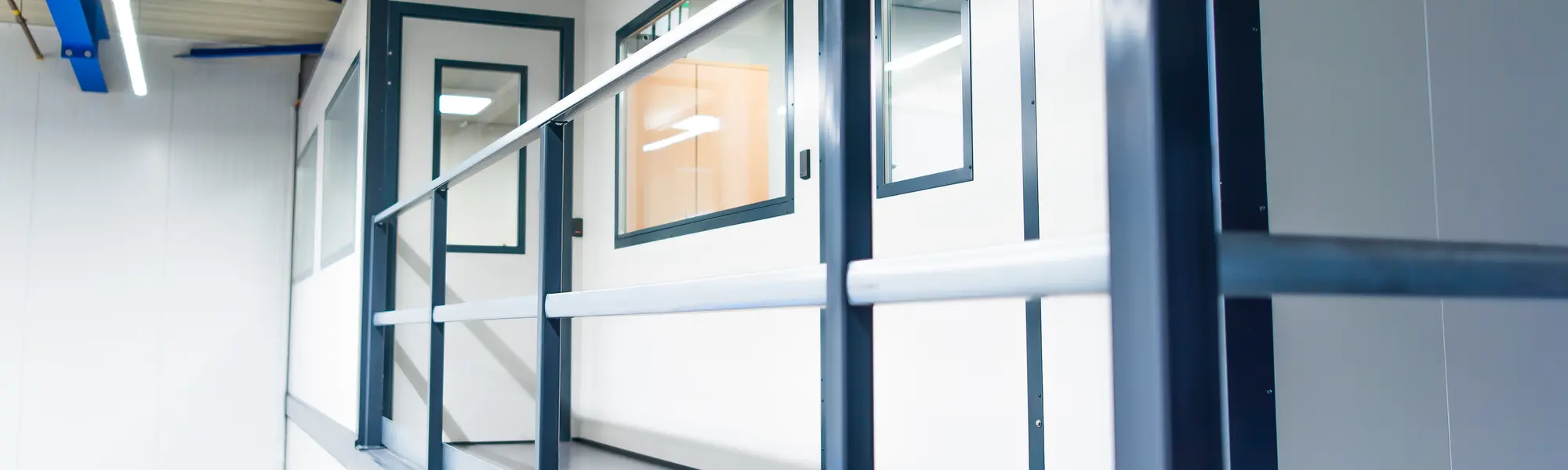 Für die erste Doppelstockanlage im Bereich Qualitätssicherung konnten wir den ca. 90 m² großen Modulraum direkt mit der Hallenwand verbinden. Für eine bessere Anbindung an die Hallenwand fertigten wir Paneel-Ausschnitte mit Dekorverkleidung für die neu eingebauten Fassadenfenster. Durch einen Schrägverlauf der Decke im Treppenbereich entstand Raum für den Einbau eines Küchenbereichs.
