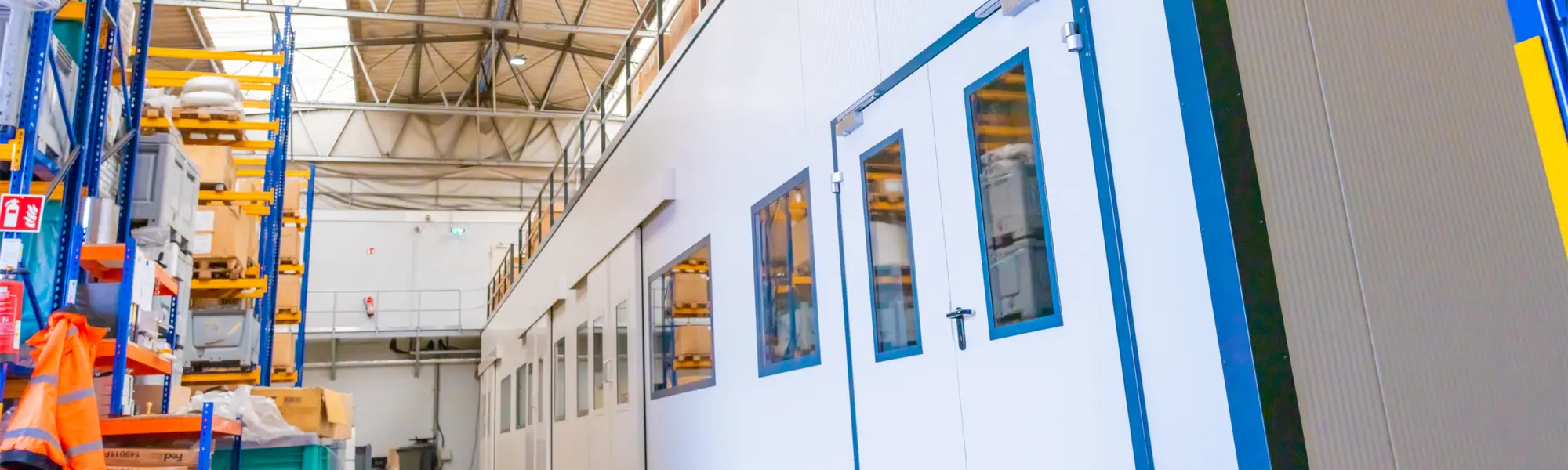 Unterhalb der Stahlbühne entstanden Produktionsräume mit einer Gesamtfläche von etwa 285 m². Um das zu realisieren, verwendeten wir 60 mm starke Schallschutz-Elemente mit einem Luftschalldämmwert von 30dB. Etwa 418 m² dieser Paneele kamen insgesamt zum Einsatz und unterteilen die Gesamtfläche in vier Bereiche. Alle verwendeten Wandpaneele sind nicht brennbar.