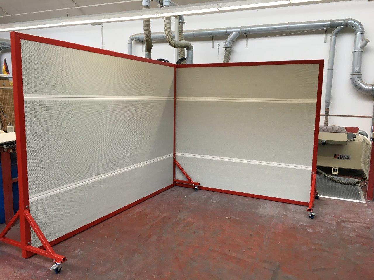 Mobile Schallschutzstellwände in Büro oder Lager- und Produktionsräumen kommen immer dann zum Einsatz, wenn die Grundfläche flexibel planbar bleiben soll und dennoch Schutz vor Lärm, Sicht oder eine Schallabsorption temporär hergestellt werden soll. Besonders vorteilhaft sind verfahrbare, nicht brennbare Stellwände in Schweißbereichen. So können Langgüter bzw. sperrige Konstruktionen dem Schweißplatz zugeführt werden und im Nachgang der Schweißbereich ohne besonderen Aufwand wieder abgesichert werden.