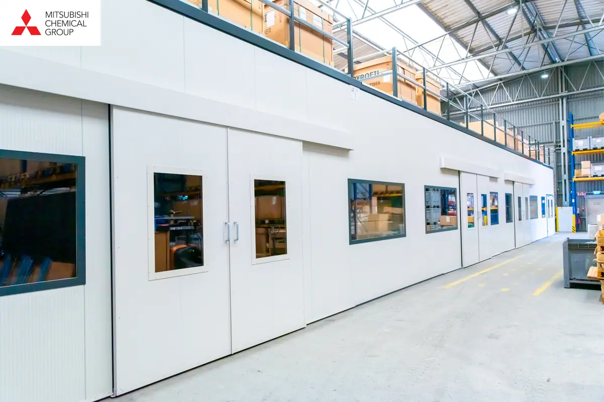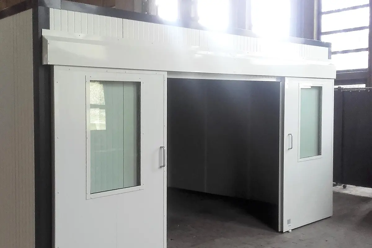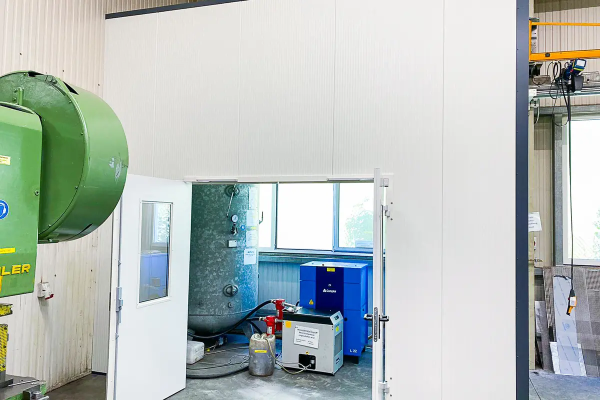 Um erhöhte Temperaturen des Arbeitsumfeldes von zum Beispiel Trocknungskammern oder Anlagen zur Produktion von Schleifpapier entgegen zu wirken, werden diese Anlagen mittels schwer entflammbarer PU-Paneele abgetrennt bzw. eingehaust.