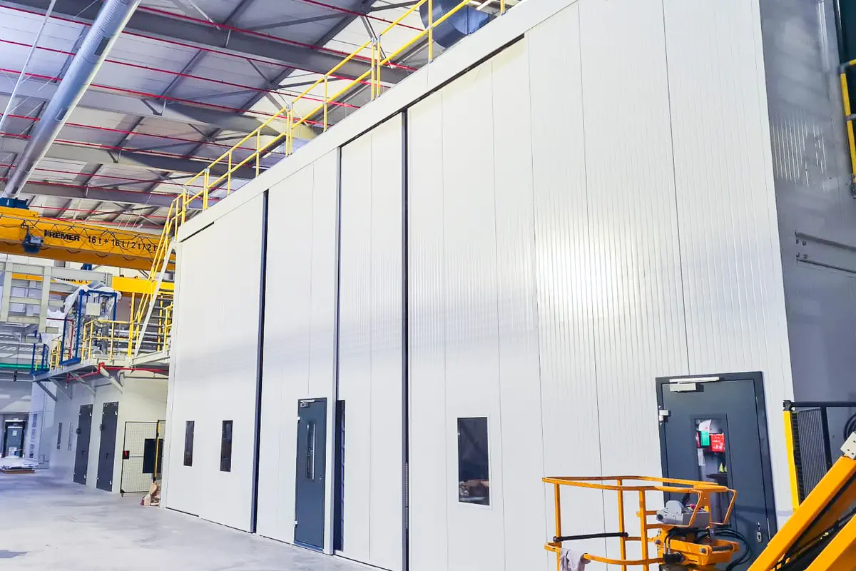 Unsere Einhausungen und Arbeitskabinen werden zum Schutz vor Lärm, Hitze, Staub und unberechtigtem Zugriff eingesetzt. Die Ausführungsart der Wand- und Deckenpaneele richtet sich nach der Anforderung an die Einhausung. Beispielsweise liegt bei einer Schutzeinhausung gegen Hitze der Fokus auf die bestmögliche, thermische Isolation, um eine konstante Temperatur in Arbeitsbereichen zu erhalten. Hier wird auf einen besonders guten Wärmedurchgangskoeffizient geachtet weshalb PU-Paneele die erste Wahl sind.