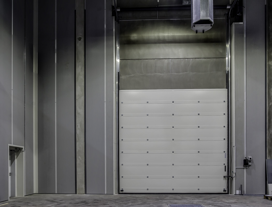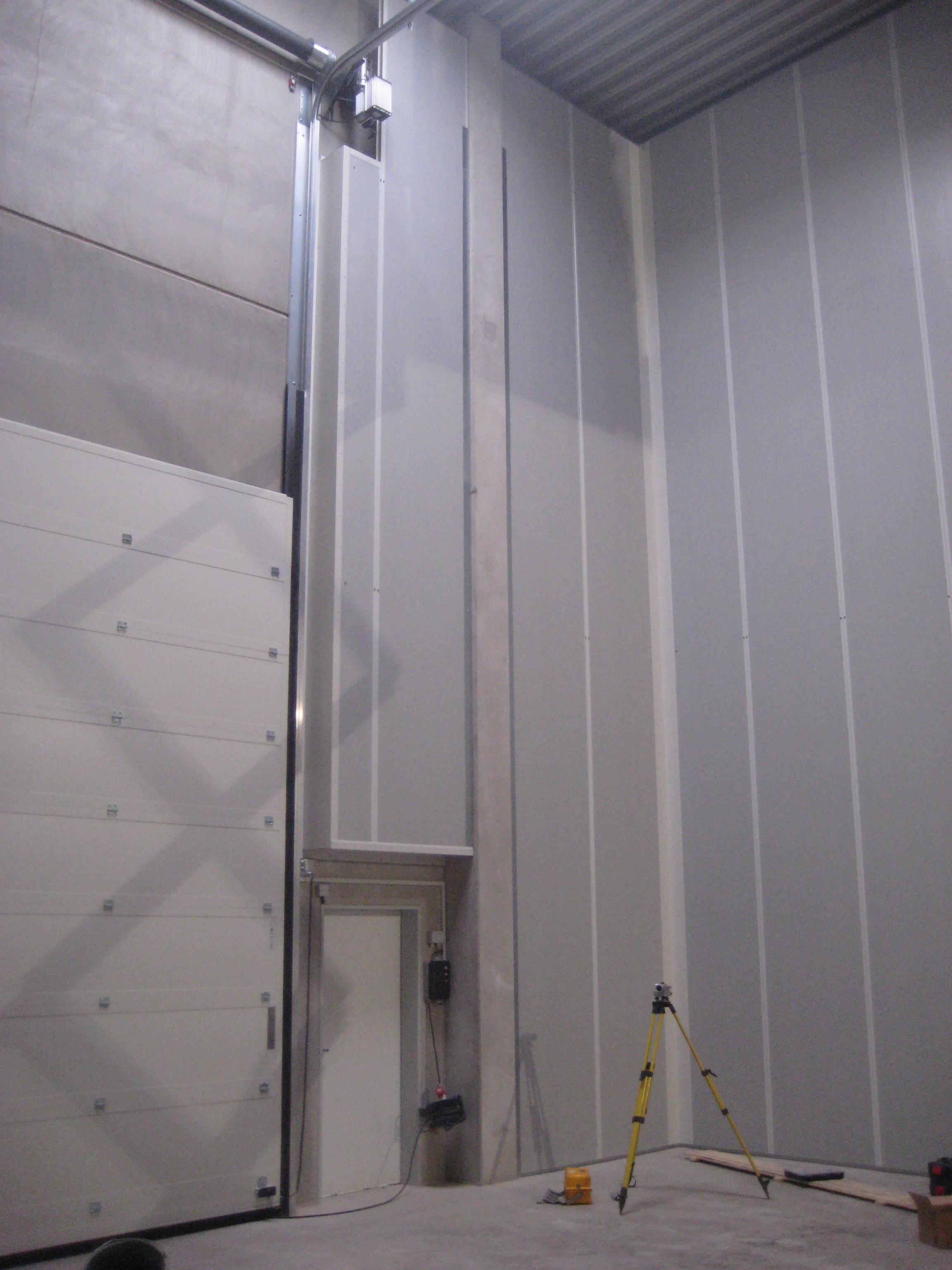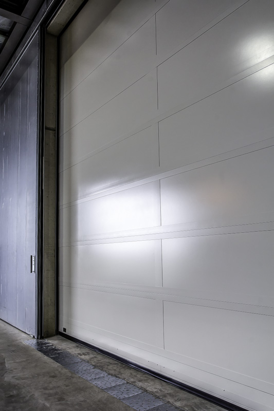 Für die Ein- und Ausfahrten des Prüfraumes wurden zwei Jansen Schallschutztore verbaut. Die Tore sind geprüft nach DIN EN ISO 140-3 und erreichen einen Schalldämmwert von 41 dB Rw, p. Die Stärke der Tore beträgt 80 mm. Die 5.000 x 5.000 mm großen Sektionaltore bestehen aus einer Rahmenkonstruktion mit Schallschutzfüllung und wurden auf Kundenwunsch, passend zur Schallschutzauskleidung, im RAL Farbton 9002 lackiert. Die senkrechten Führungsschienen der Schallschutztore verfügen über eine innere und äußere Profildichtung, einen rundum Eingreifschutz sowie integrierte Tragseilführung. Angetrieben werden die Tore durch einen hochwertigen, federlosen Wellenantrieb. Die Hubgeschwindigkeit der Toranlage liegt bei ca. 0,20 m/s. Ferner wurden die Toranlagen mit Automatiksteuerung, Sicherheitskontaktleiste und Lichtschranke sowie einem Extra-Meldemodul für eine zentrale Zustandsabfrage ausgestattet.