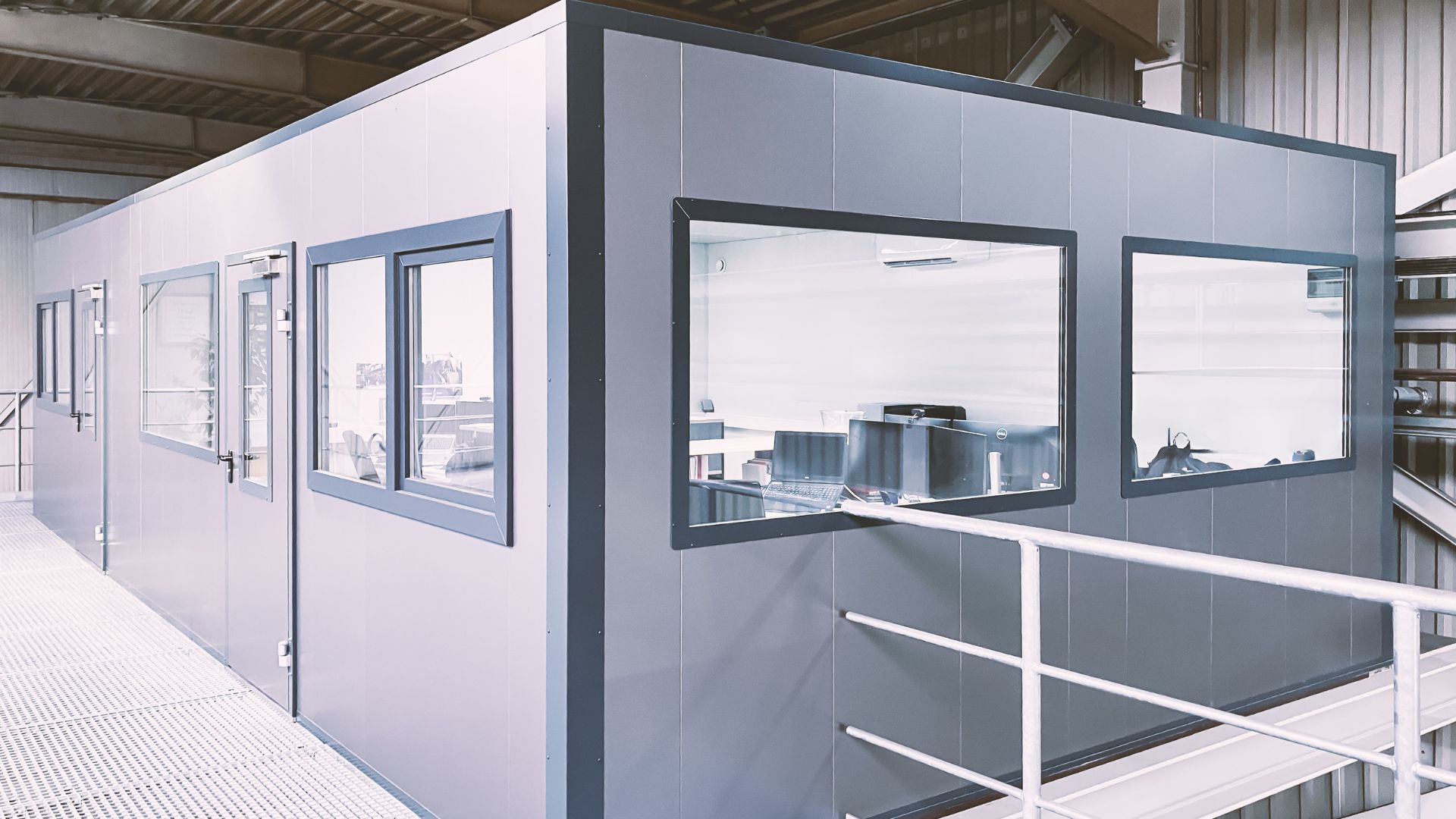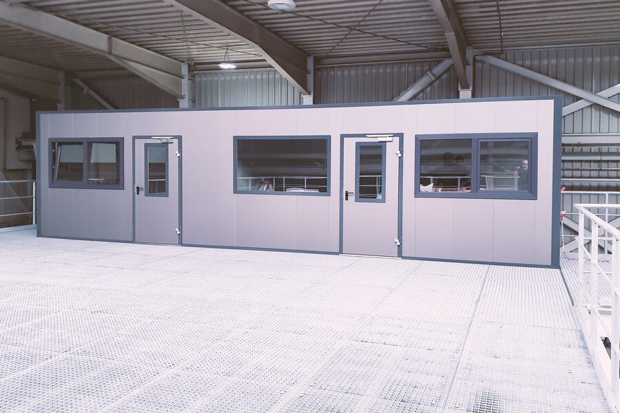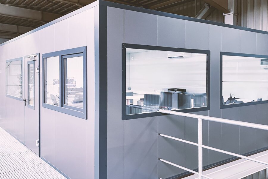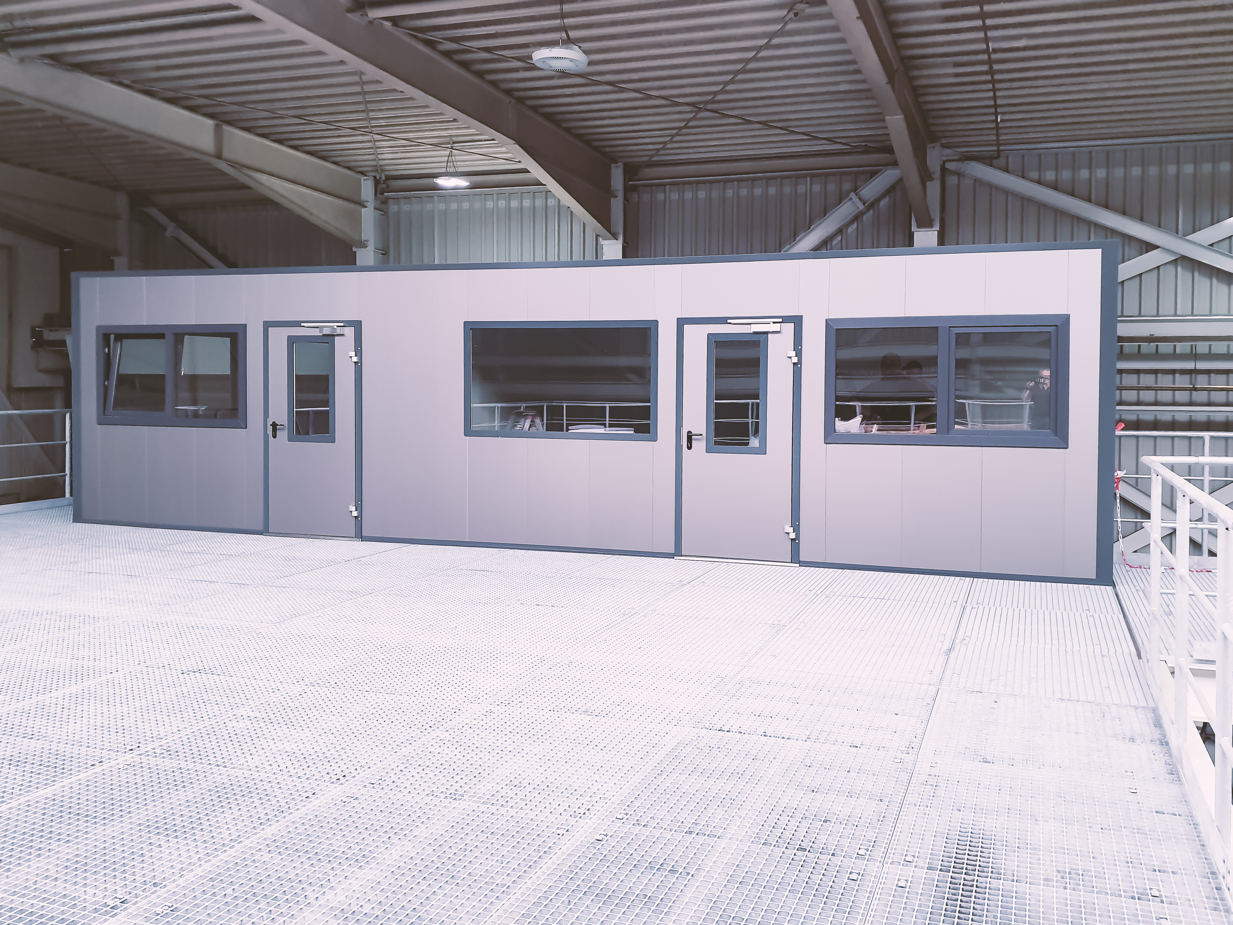 • Hallenbüro auf Stahlbühne: Das auf einer vorhandenen Stahlbühne montierte Hallenbüro wurde durch eine funktionale Trennwand unterteilt und bietet optimale Raumaufteilung.