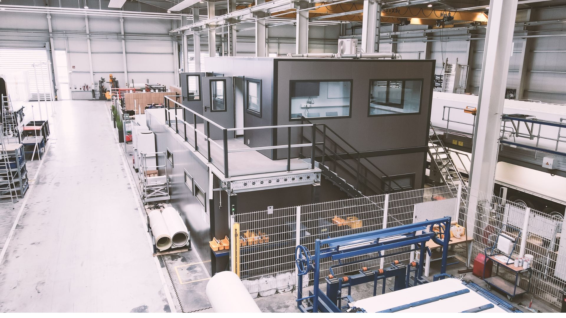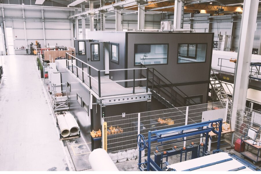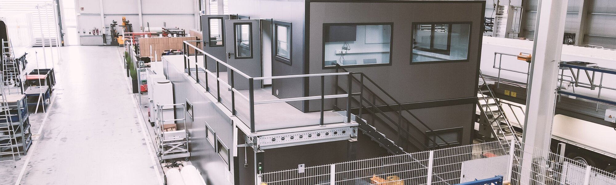 Durch die Kombination verschiedener Raumsysteme der Firma Jansen Systembau, die nach Kundenvorgaben gestaltet wurden, ist eine effiziente Doppelstockanlage und ein zusätzliches Hallenbüro in höchster Qualität entstanden.