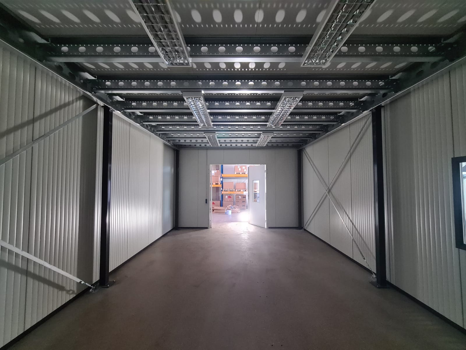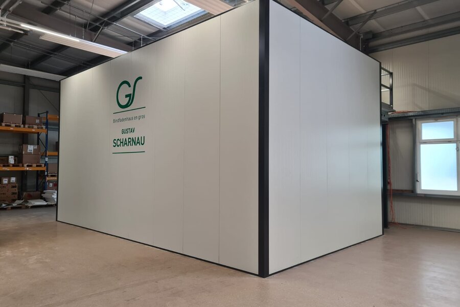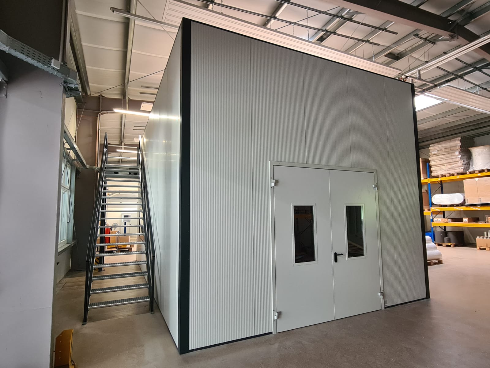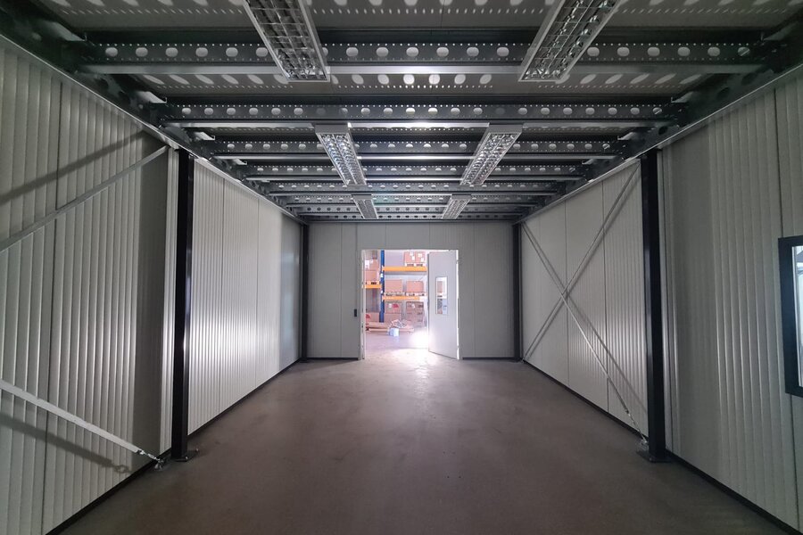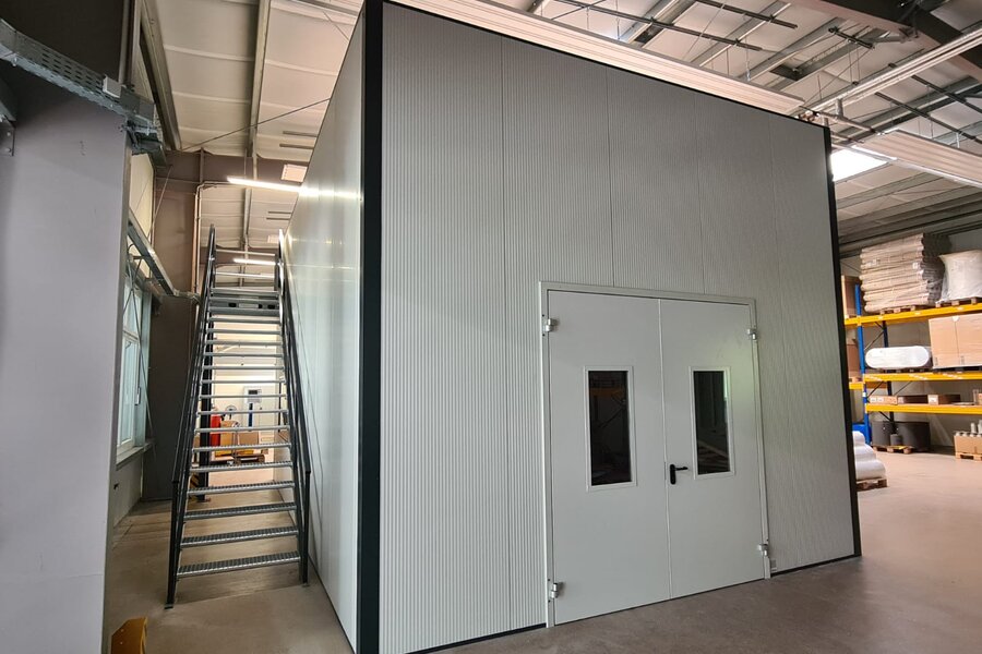 Die Elemente der ca. 40 m² große Maschineneinhausung wurden ebenerdig montiert. Die Nutzung des vorhandenen Hallenbodens bietet den Vorteil eines barrierefreien Zugangs. Mit einer Raumhöhe von 3 m und der Doppelflügeltür können die Filteranlagen problemlos untergebracht werden.