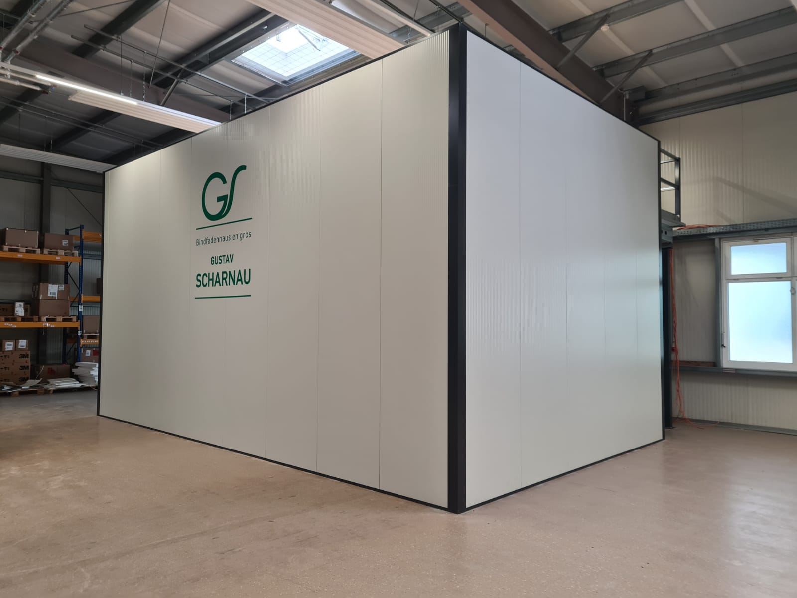 Die Firma Bindfadenhaus en gros Gustav Scharnau GmbH ist Spezialist und Technolgieführer im Bereich selbstklebende Zulieferteile für die Industrie, speziell für den Bereich Automotive. Für das neue 750qm große Laserzentrum, ausgestattet mit 6 Brennköpfen, ist diese Maschineneinhausung eine ideale Trennung der Filteranlagen vom restlichen Produktionsbereich. Dies bietet Vorteile im Bereich Arbeitsschutz (Reduzierung der Geräusch- und Geruchsentwicklung) und ist zudem eine sehr platzsparende Individuallösung.