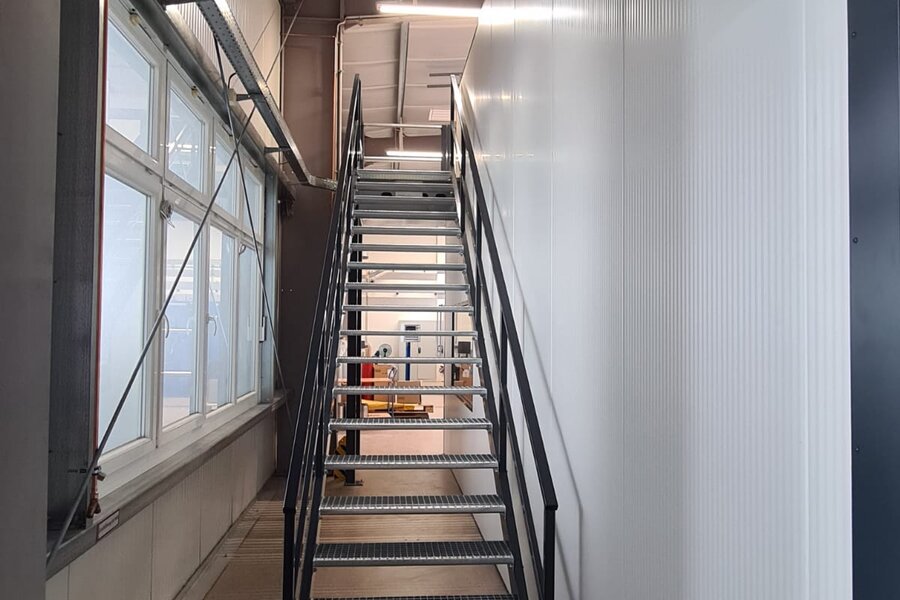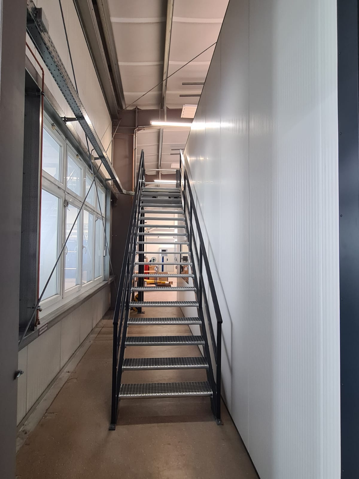 Die Besonderheit dieser Einhausung ist die zusätzliche Lagerfläche auf dem Filterraum. Durch die Integration einer Lagerbühne mit Treppe und Podest, kann nun die Raumkapazität in der Halle optimal ausgenutzt werden. Mit einer zulässigen Bühnenbelastung von 500 kg/m² und einer Nutzfläche von 40 m² bieten sich unzählige Abstell- und Lagermöglichkeiten.
