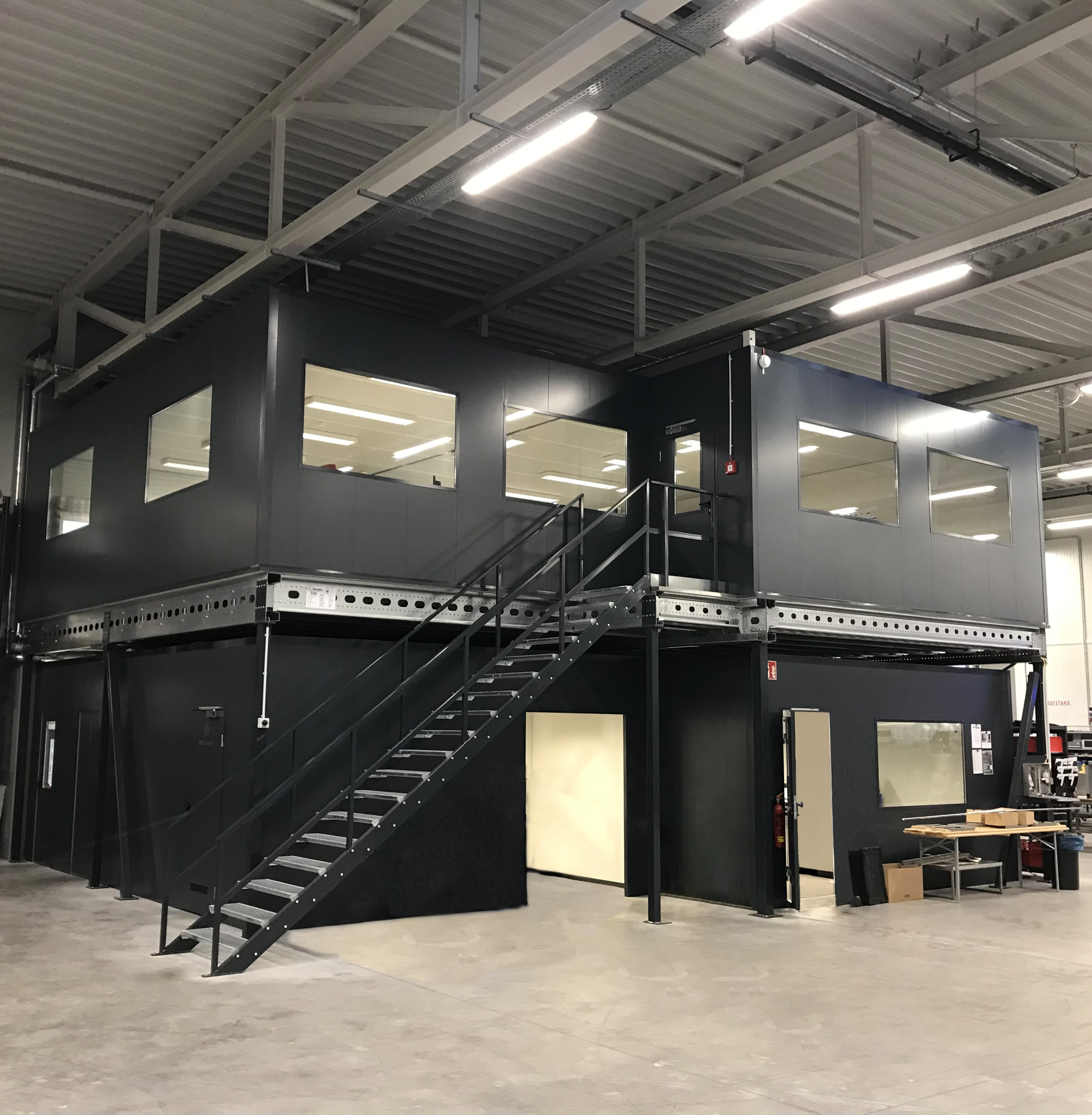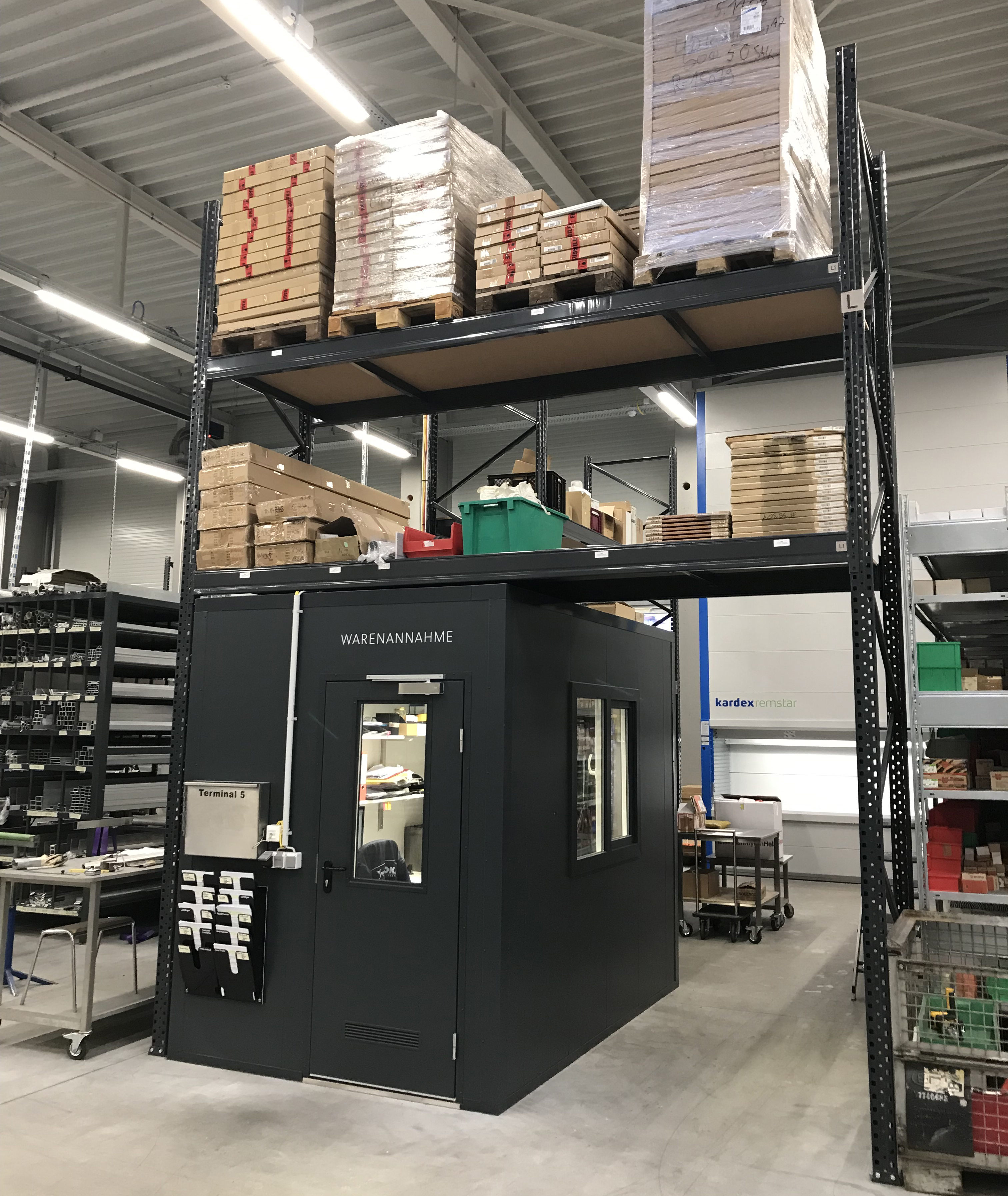 Weiter hinzu kommt eine Lagerbühne mit Zugangspodest, Treppe und Palettenübergabestation. Die Lagerbühne umfasst eine Stellfläche von 200 m² und ist mit einem umlaufenden Geländer versehen. Für die Warenannahme hat Jansen ein weiteres Büro mit den Maßen 2 x 3 x 2,5 m errichtet. Hier wurde u. a. ein Kunststofffenster in Dreh-Kipp-Ausführung verwendet. Durch das Fachpersonal von Jansen wurde darüber hinaus die komplett gewünschte Elektrik wie Beleuchtung, Steckdosen und Netzwerk installiert und verdrahtet.