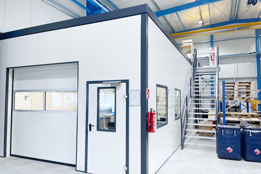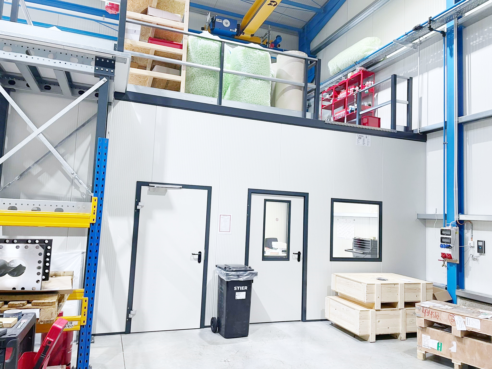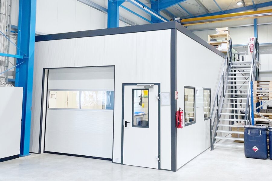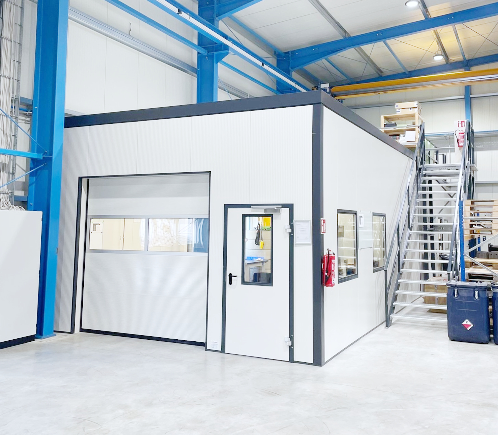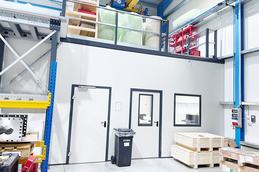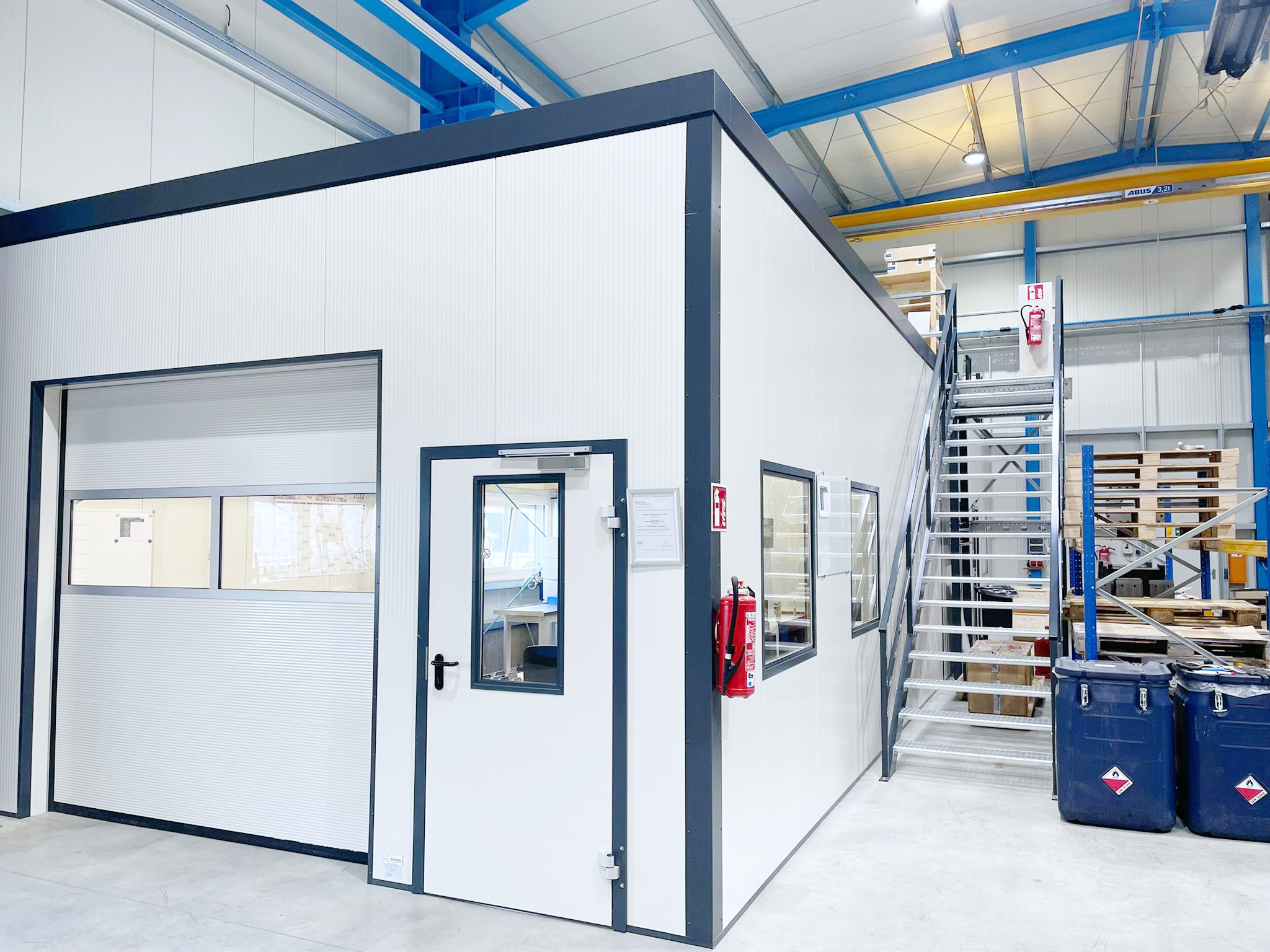 Beim Einzug in die neue Produktionshalle entstand Bedarf nach neuen Halleneinbauten. Das Unternehmen Extruder Experts aus Monschau benötigte für die neue Messmaschine der Klostermann GmbH & Co. KG einen klimatisierten Messraum mit Sektionaltor. Außerdem wurden neue Büroräume und eine sanitäre Anlage gebraucht. Die Decke des Halleneinbaus muss begehbar und belastbar sein, damit dort Verpackungsmaterial gelagert werden kann.