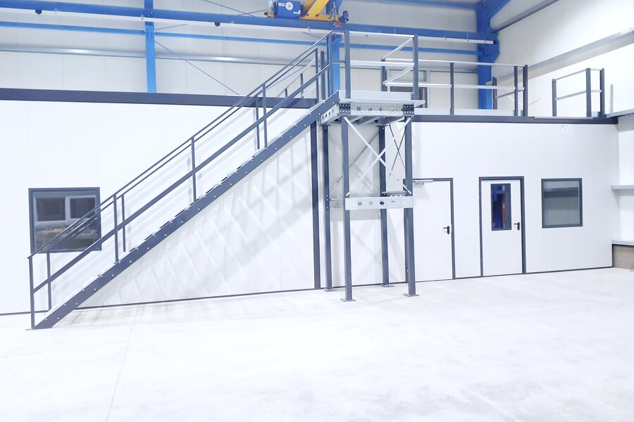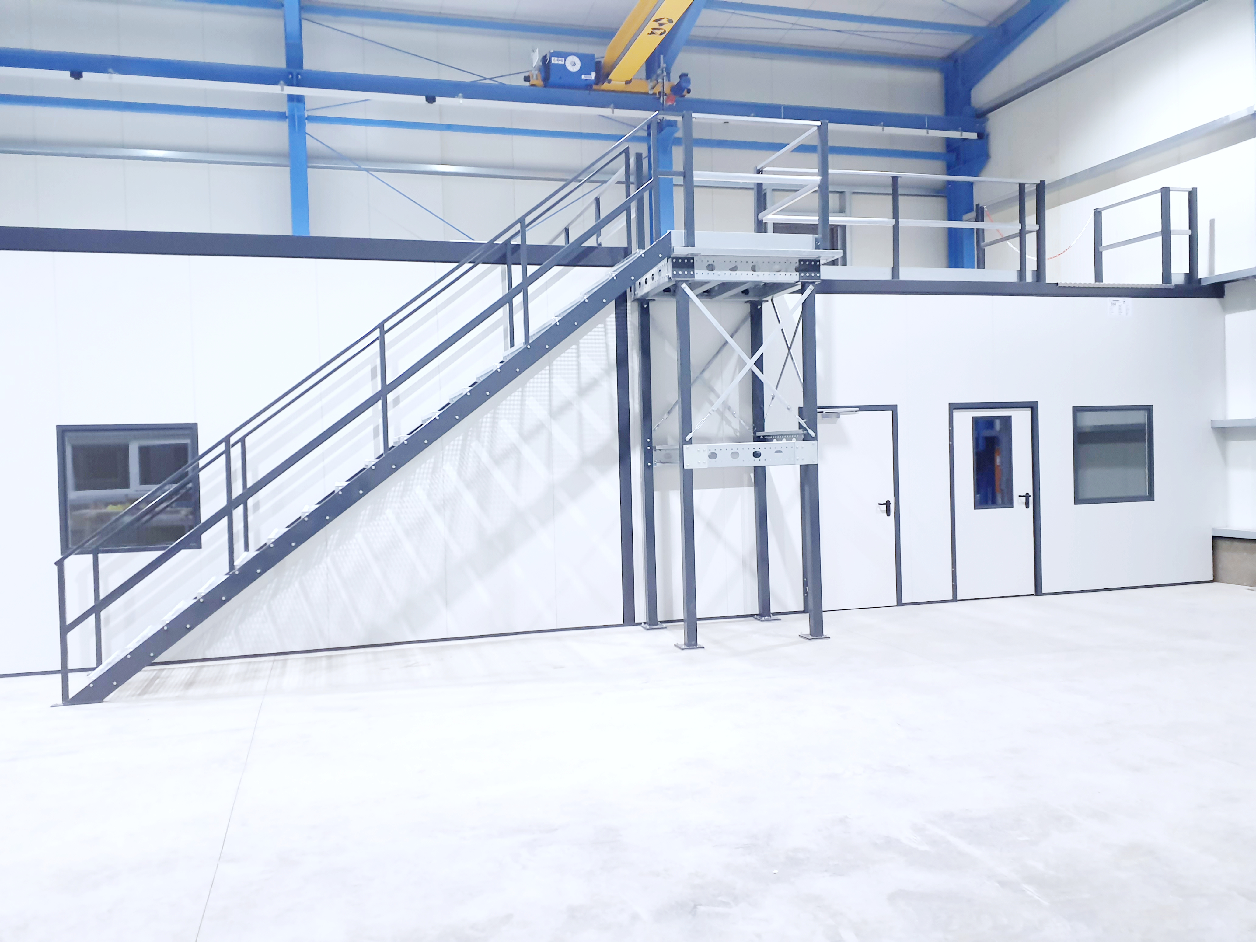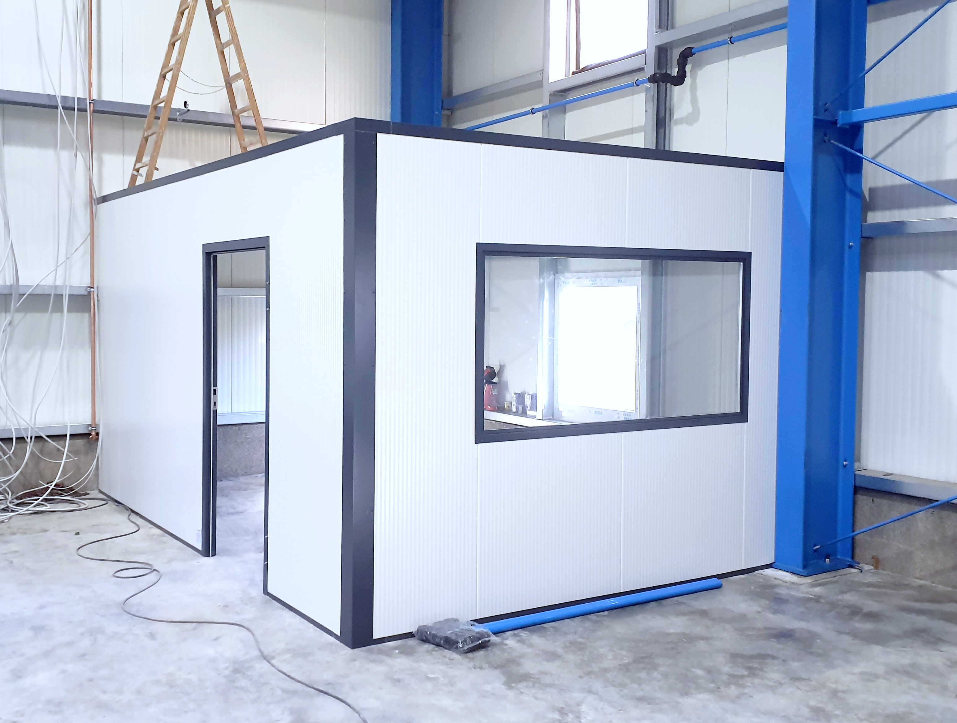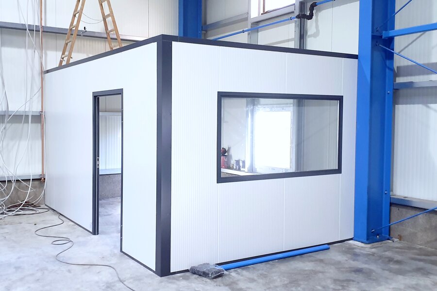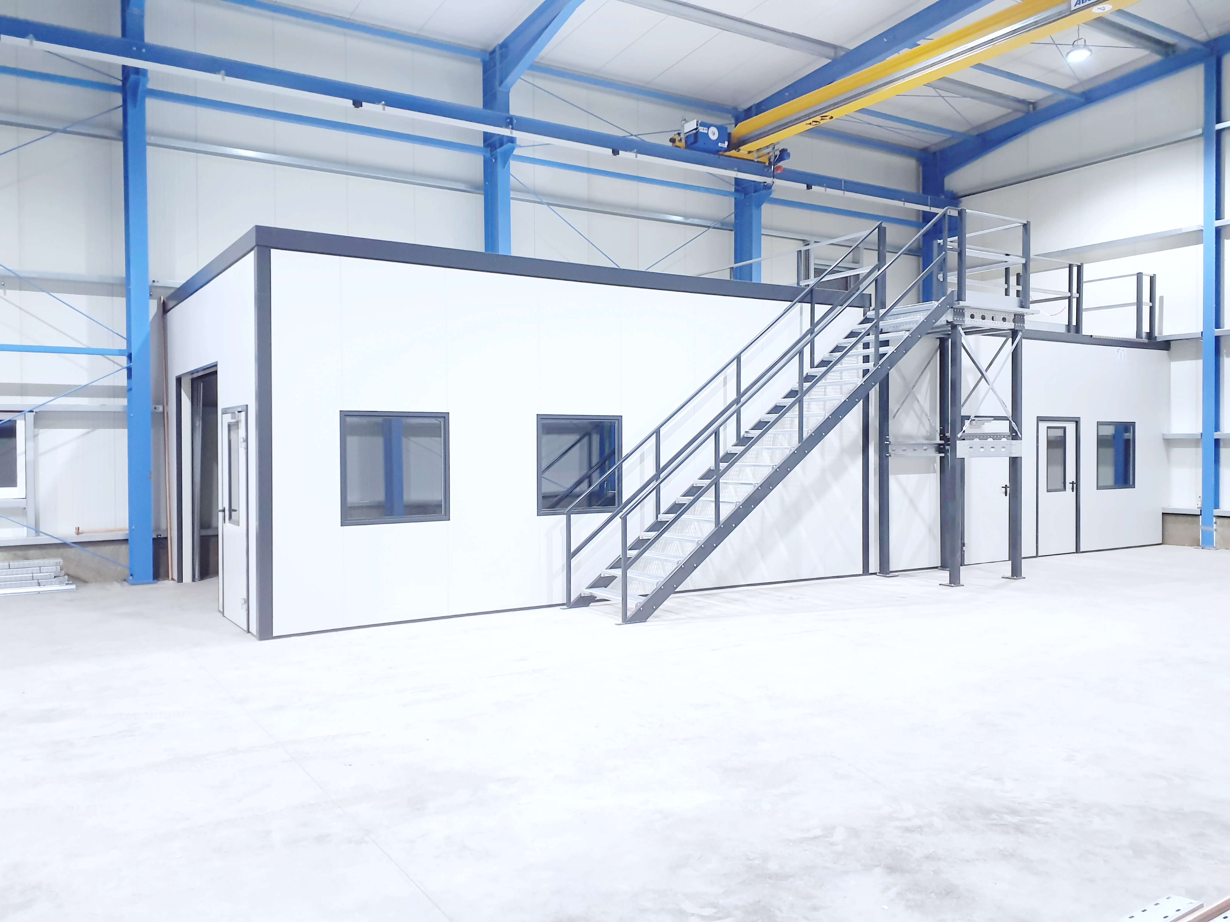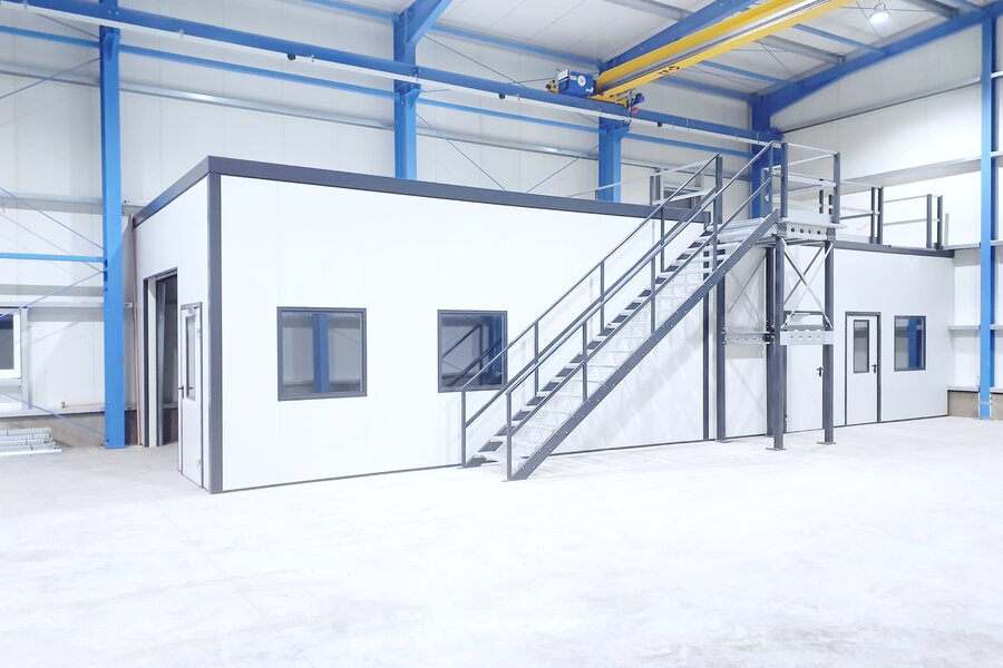 Beim Einzug in die neue Produktionshalle entstand Bedarf nach neuen Halleneinbauten. Das Unternehmen Extruder Experts aus Monschau benötigte für die neue Messmaschine der Klostermann GmbH & Co. KG einen klimatisierten Messraum mit Sektionaltor. Außerdem wurden neue Büroräume und eine sanitäre Anlage gebraucht. Die Decke des Halleneinbaus muss begehbar und belastbar sein, damit dort Verpackungsmaterial gelagert werden kann.