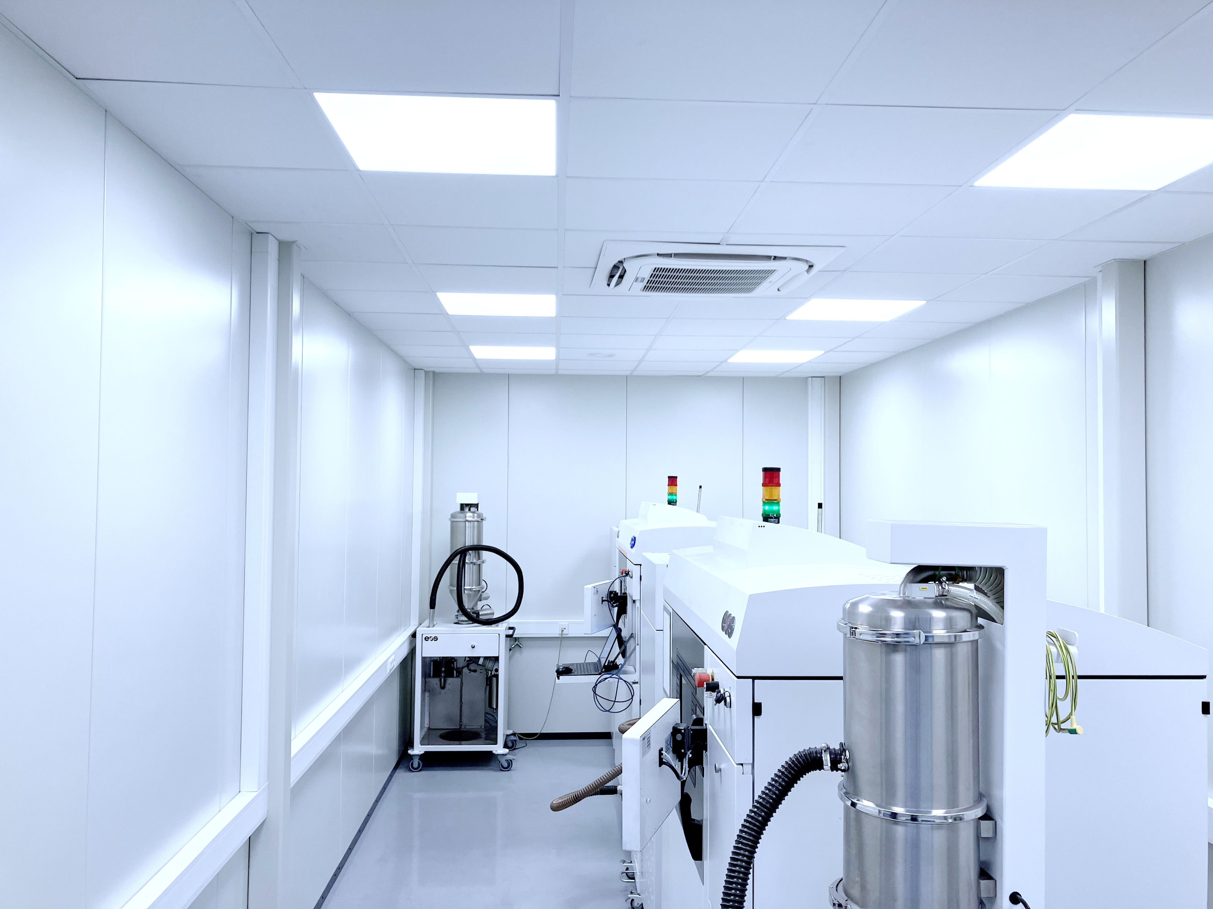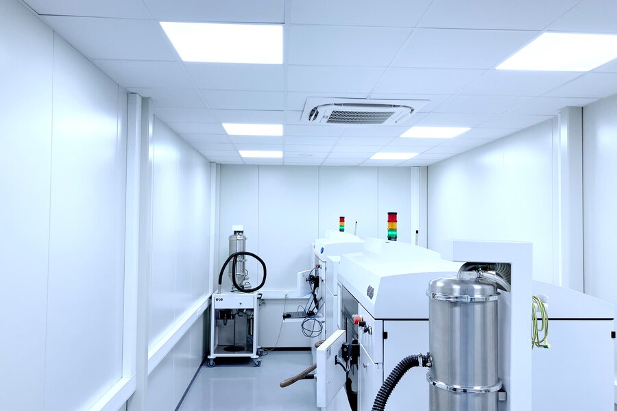 - Eine abgehängte Mineralfaserdecke in den Messräumen wurde als zusätzliche Ebene für Klima-, Lüftungs- und Elektroleitungen eingebaut. Für eine qualitätsrelevante Sichtprüfung wurden dort außerdem LED-Leuchten als Einlegeleuchten verbaut.