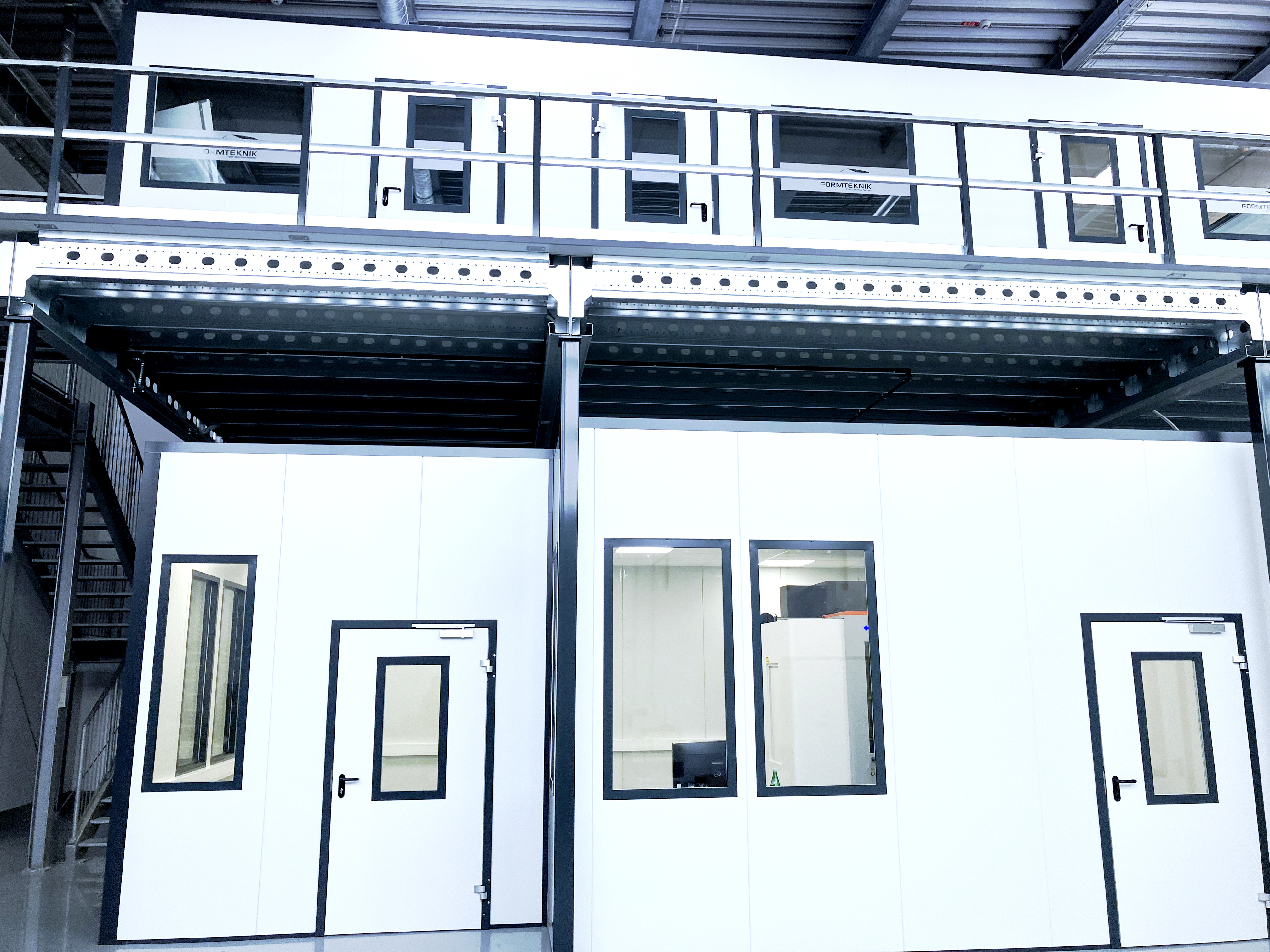 Die FORMTEKNIK GmbH liefert ihren Kunden schlüsselfertige Komplettlösungen, die sich durch Qualität, Langlebigkeit und Innovation auszeichnen. Um diesen Ansprüchen gerecht zu werden, wurde ein multifunktionales Raumsystem mit Messräumen im Erdgeschoss und Büros im 1. Stock benötigt. Zu den Anforderungen gehörte die Schaffung einer prozesssicheren und geschützten Umgebung für unterschiedliche Maschinen und Messanwendungen, in der konstante Temperatur- und Luftfeuchtigkeitsbedingungen vorherrschen. Für die Büroräume im 1. Stock war lärmbefreites Arbeiten mit Hallenblick nach geltenden Standards der Arbeitsstättenverordnung (ASR) gewünscht. Eine Anpassung des neuen Raumsystems an vorhandene Gebäudestrukturen und die Integration bereits vorhandener Infrastruktur waren ebenfalls Teil der Aufgabe.