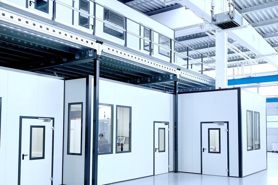 - Eine Maschineneinhausung bietet Schutz vor Lärm, Staub und schwankenden Luft- und Klimabedingungen. Isolierte Wand- und Deckenelemente mit geringen Wärmedurchgangskoeffizienten liefern eine konstante Prozessumgebung für qualitative Messungen. Es wurden zusätzliche Schallabsorption und erhöhte Schalldämmung installiert.