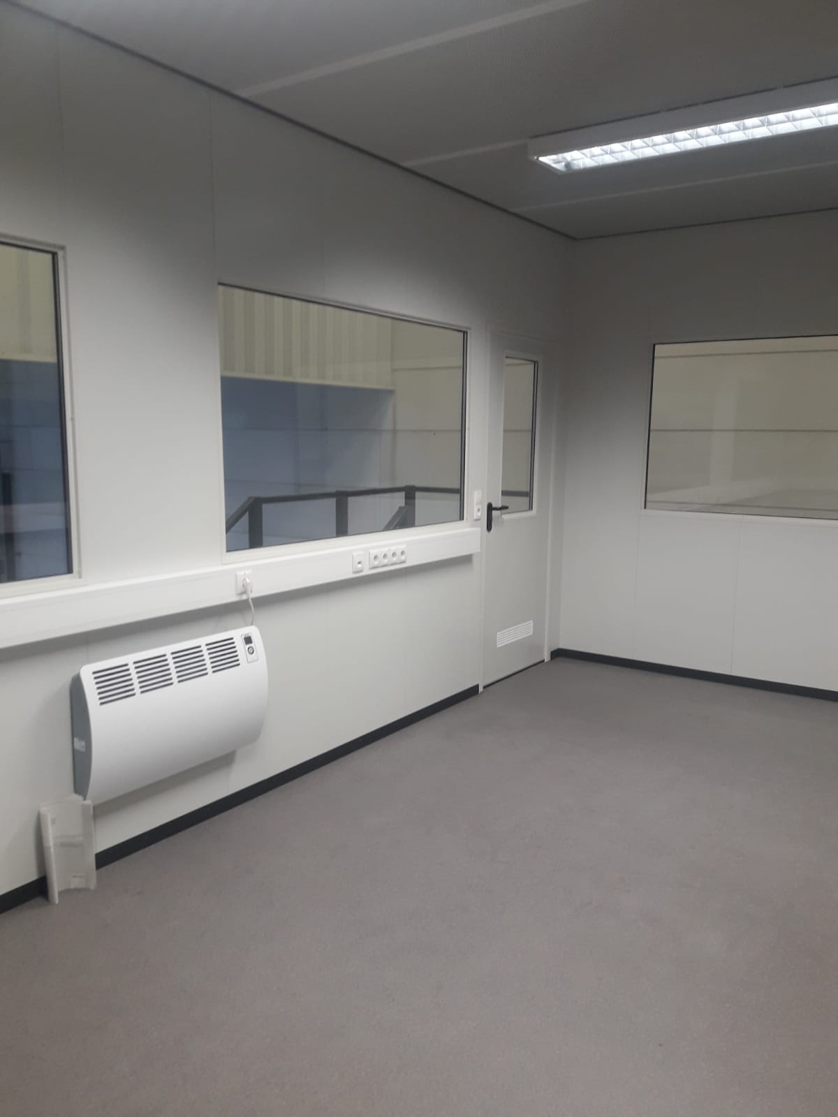 Alle Hallenbüros sind mit Elektro- und Beleuchtungspaket, sowie Heizkonvektoren ausgestattet. Die Jansen Systembau GmbH & Co. KG lieferte zunächst einen werksfertigen Modulraum (IN-CO).