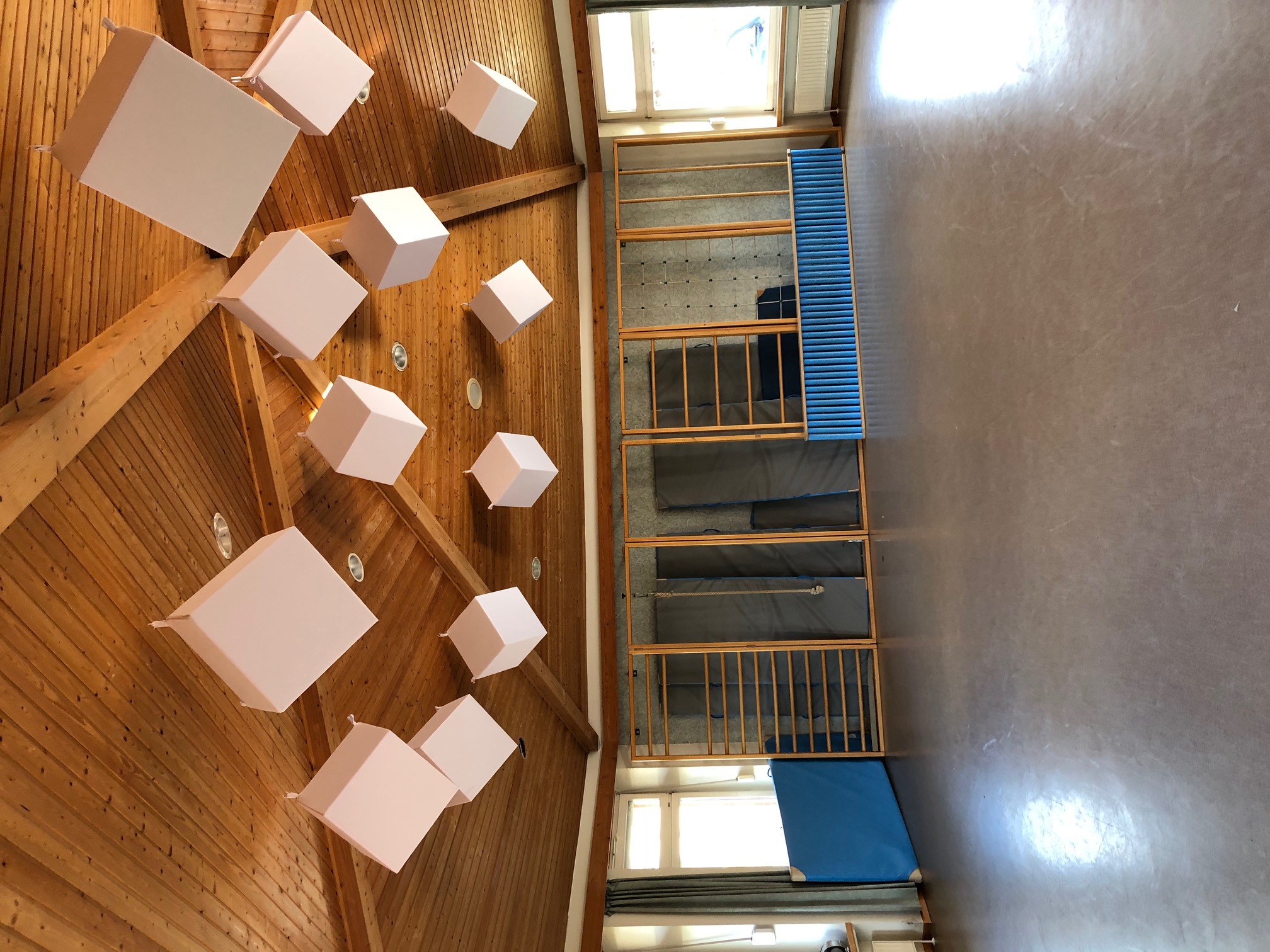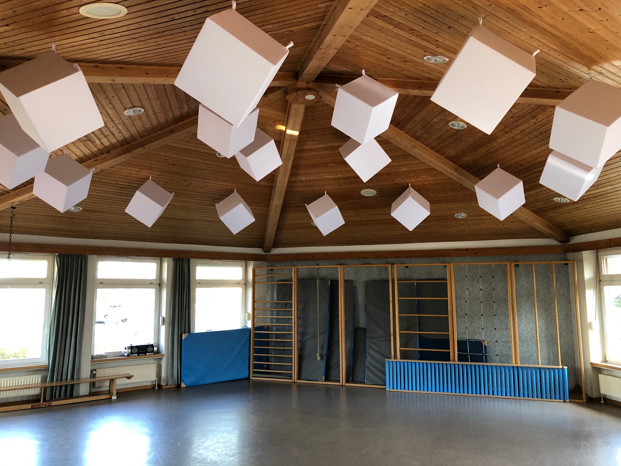 In der Turnhalle des Kindergartens Ramsloh können Kinder und Erzieherinnen wieder etwas entspannter spielen. Mehrere Akustikwürfel wurden an die Decke installiert und verbessern deutlich merkbar die Akustik im Raum.