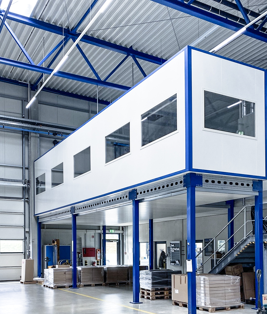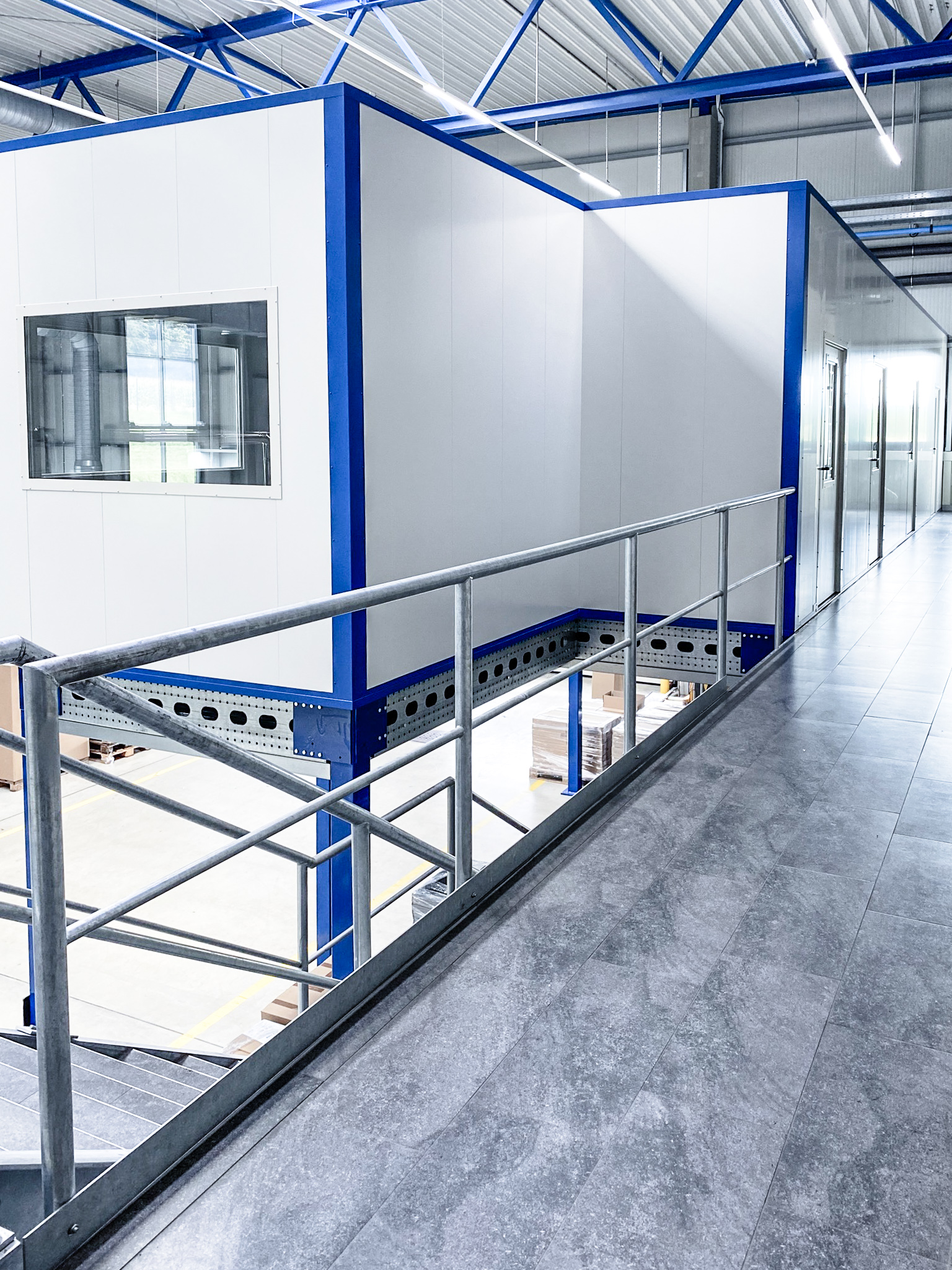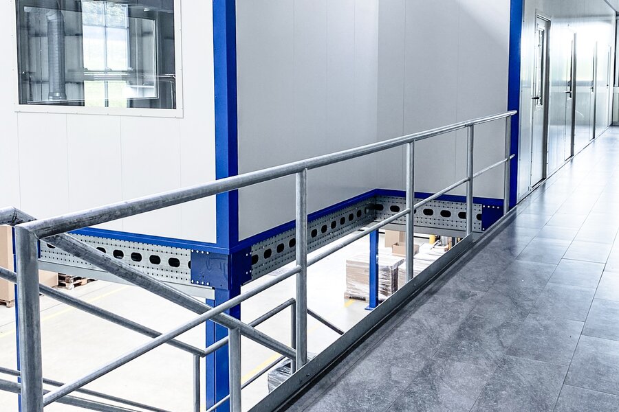 - Es wurde eine tragfähige, bewegungsarme Stahlbühne eingebaut. Ein Bestandspodest im 1. Stock und eine vorhandene Treppenanlage wurden in das neue Raumsystem integriert. Die Stahlträger sind auf Kundenwunsch in RAL 5010 Enzianblau beschichtet. Unterhalb der Stahlbühne entstand ausreichend Freiraum für Installationen wie Beleuchtung oder Sprinklerung.