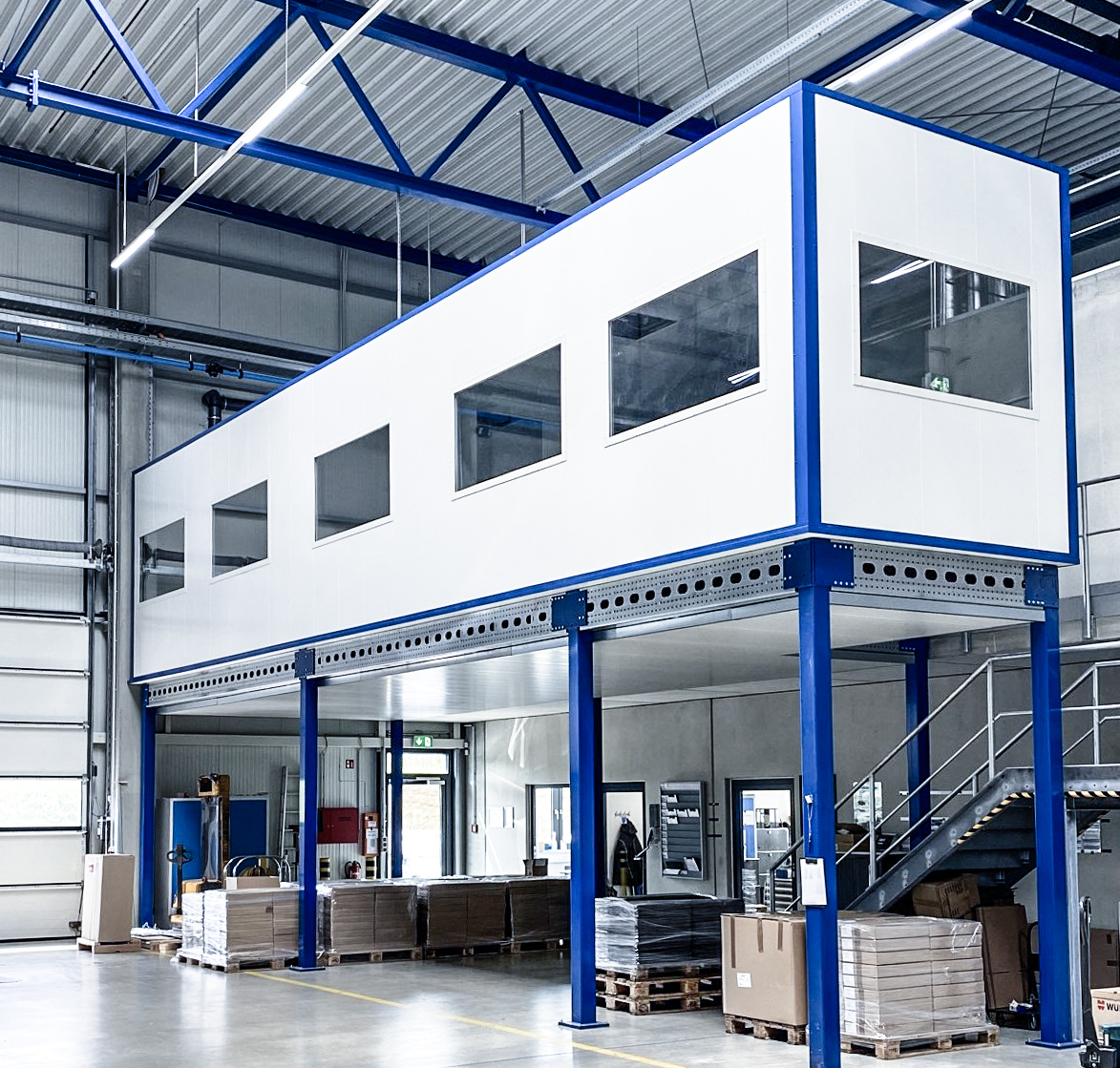 Die Hallenbüros der Firma Jansen Systembau bieten eine intelligente und flexible Raumnutzung, die an alle Bedürfnisse angepasst werden kann. So konnte für die Firma Kempf GmbH nach einem Vor-Ort Termin mit Beratung und Aufmaß ein 2-stöckiges Hallenbüro auf Stahlbühne mit insgesamt 4 Räumen in höchster Qualität umgesetzt werden.