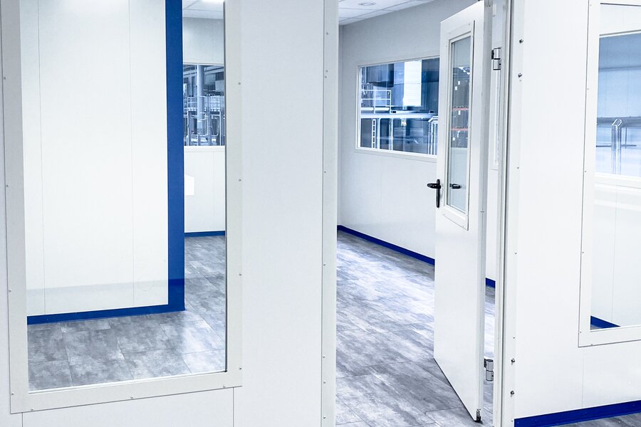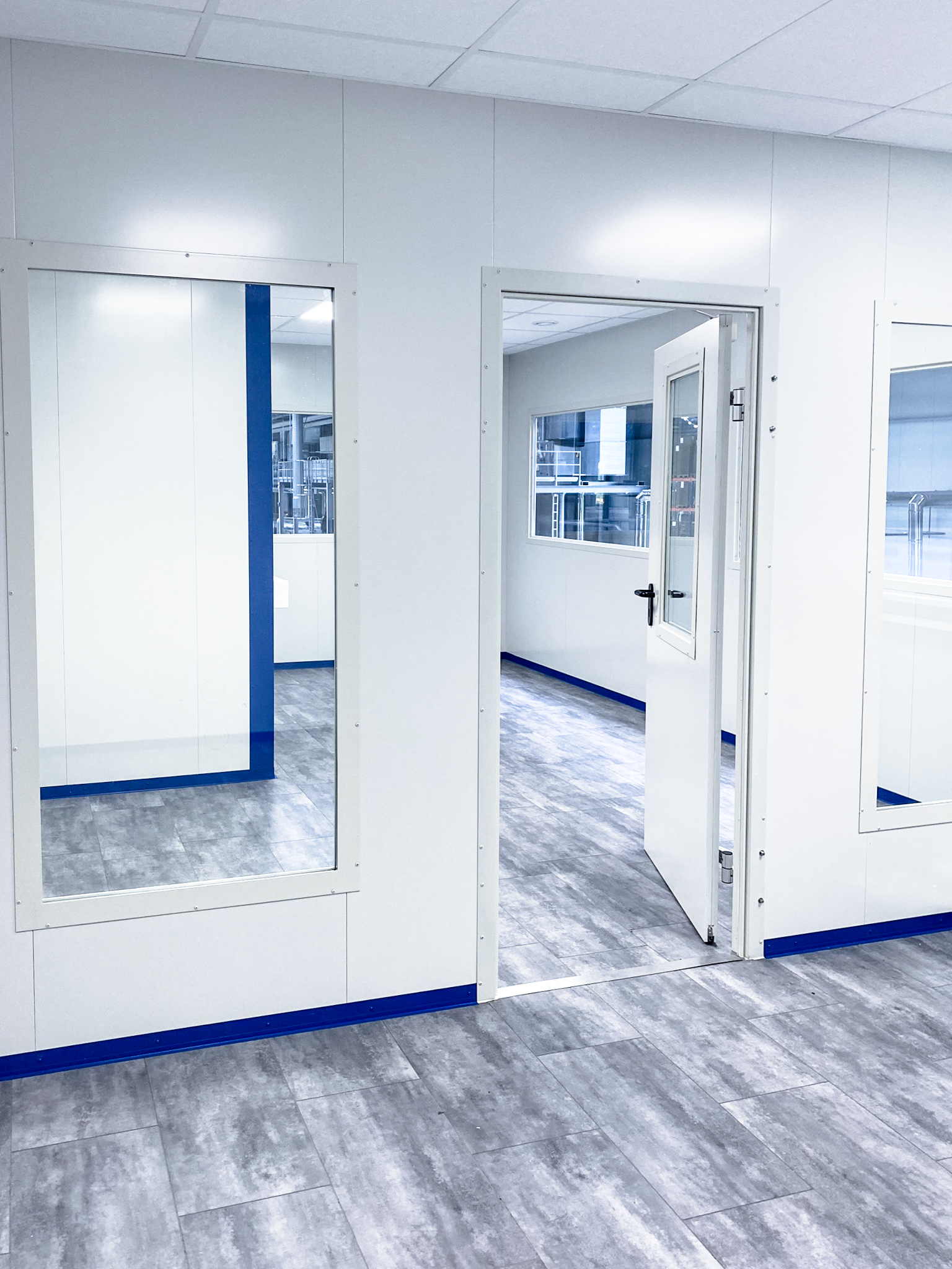 - Die Büroräume sind mit schallisolierenden und lärmabsorbierenden Wand- und Deckenelementen ausgestattet. Bodennahe Fenster im Besprechungsraum und weitere isolierte Fensterelemente sorgen für gute Lichtverhältnisse und den Blick in die Produktion. Ein hochwertiger Bodenbelag mit Trittschalldämmung unterstützt ebenfalls das lärmbefreite Arbeiten und sorgt für eine ansprechendes Arbeitsumfeld.