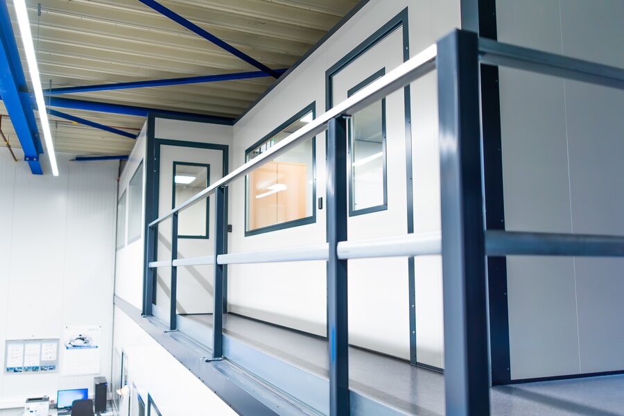Für die erste Doppelstockanlage im Bereich Qualitätssicherung konnten wir den ca. 90 m² großen Modulraum direkt mit der Hallenwand verbinden. Für eine bessere Anbindung an die Hallenwand fertigten wir Paneel-Ausschnitte mit Dekorverkleidung für die neu eingebauten Fassadenfenster. Durch einen Schrägverlauf der Decke im Treppenbereich entstand Raum für den Einbau eines Küchenbereichs.