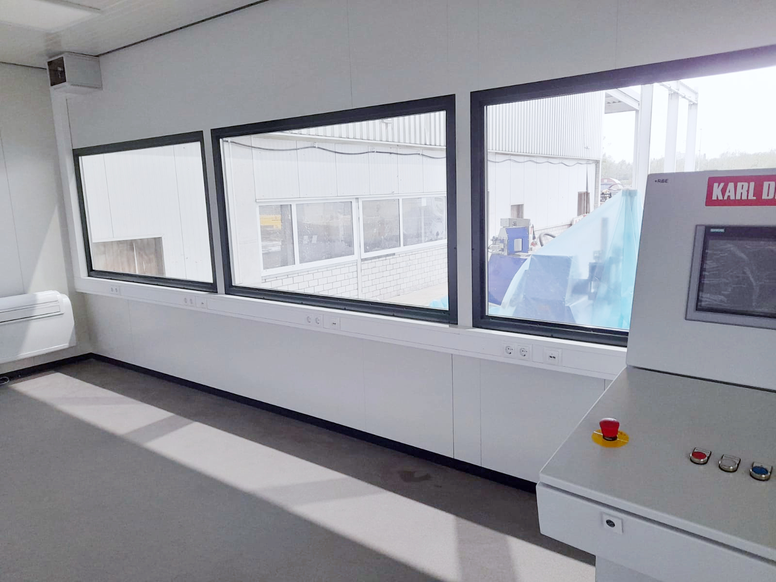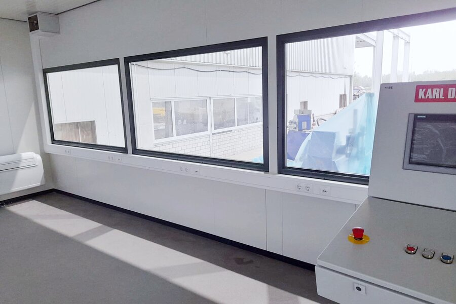 Einen guten Ausblick auf die Anlage bieten die drei großen Verglasungen aus 26 Millimeter starkem Isolierglas. Die Tür mit absenkbarer Bodendichtung sowie die gewählten Wand- und Deckenausbildungen aus nicht brennbaren Mineralwolle-Paneelen bieten eine gute Akustik, den nötigen Schallschutz und eine hohe Wärmeisolation.