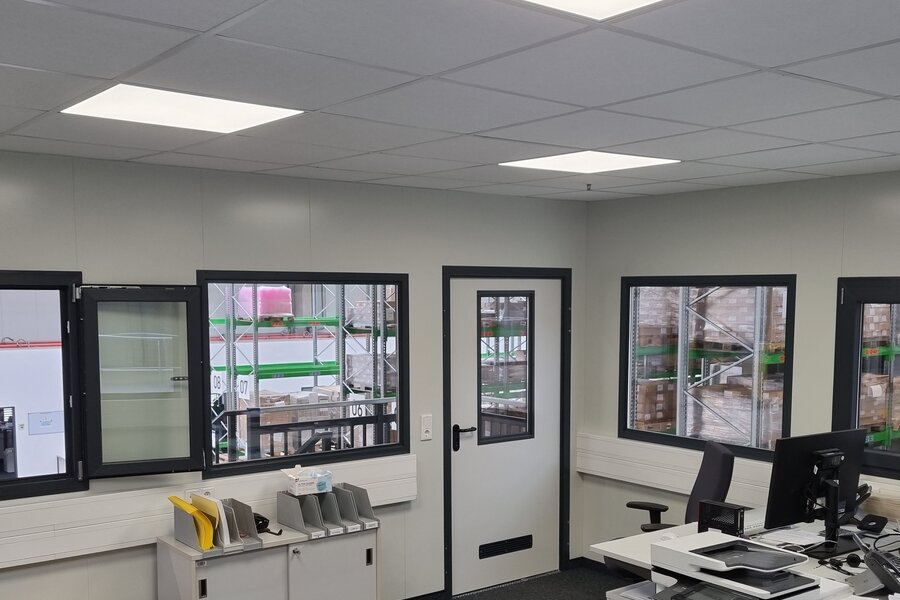 Für ein gesundes Arbeitsklima sorgen die Wand- und Deckenpaneele aus nicht brennbaren Baustoffen der Klasse A1 mit Schalldämwerten Rw,p von 30-34 dB. Zur Schaffung einer Installationsebene für Beleuchtung und Sprinkleranlage wurde zudem eine zusätzliche Rasterdecke eingebaut. Für Wartungs- und Installationsarbeiten ist die Decke des Modulraums begehbar.