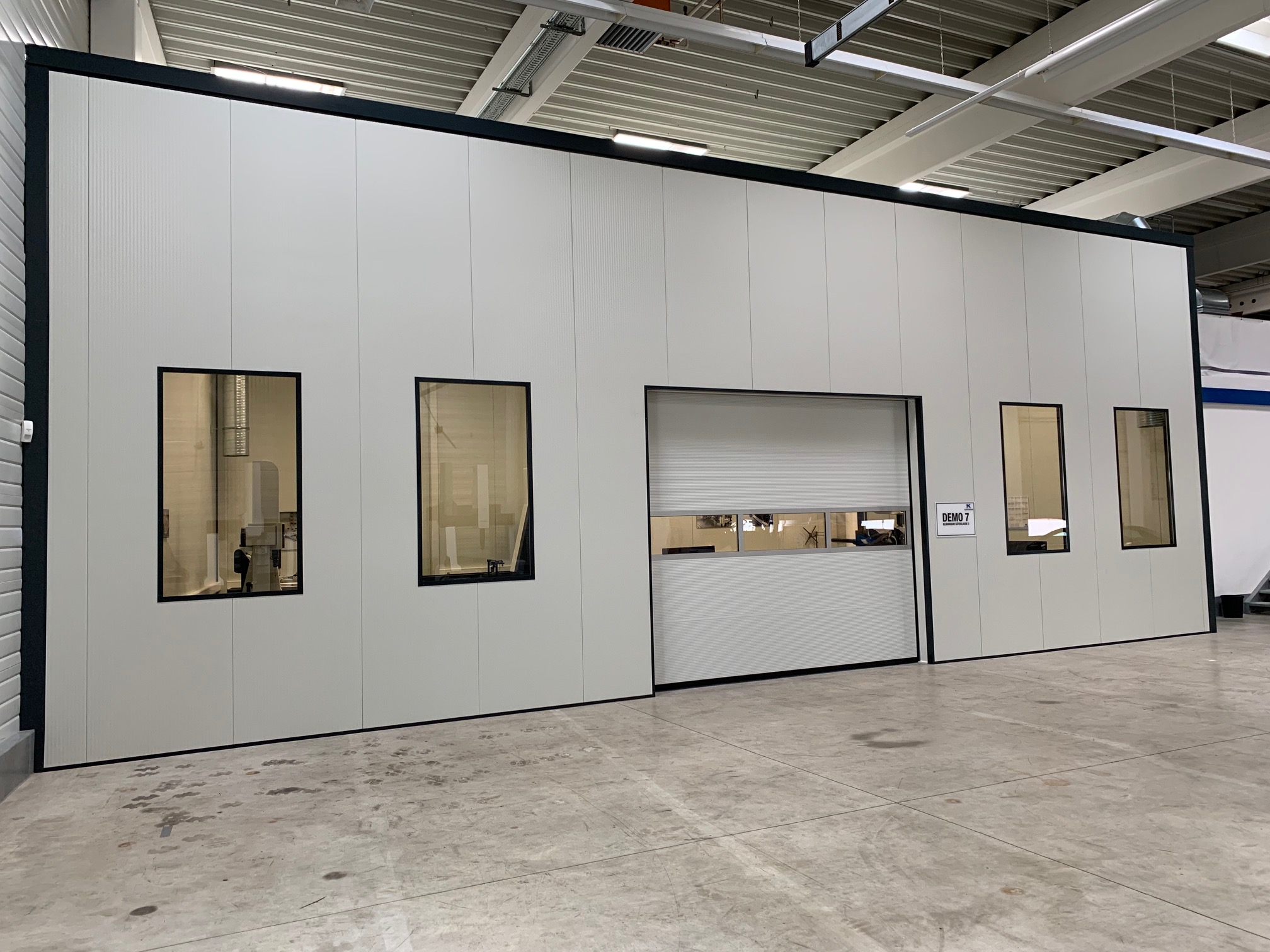 Der ca. 110 m² große Messraum mit den Abmessungen 8,00 x 14,00 m sollte ohne störenden Mittelstützen im Stahlbau mit einem großen Sektionaltor ausgestattet sein. Auf Grund der großen Überspannungen wurde bereits in der Angebotsphase eine Stahlbauunterkonstruktion eingeplant. Das Sektionaltor (3,5m x 3,0m) aus dem Hause Jansen Tore wurde an den Stahlbau angeschlagen und bildete, zusammen mit den 80 mm starken und hoch isolierenden Wand- und Deckenelementen, die optimale Hülle des Raumes.