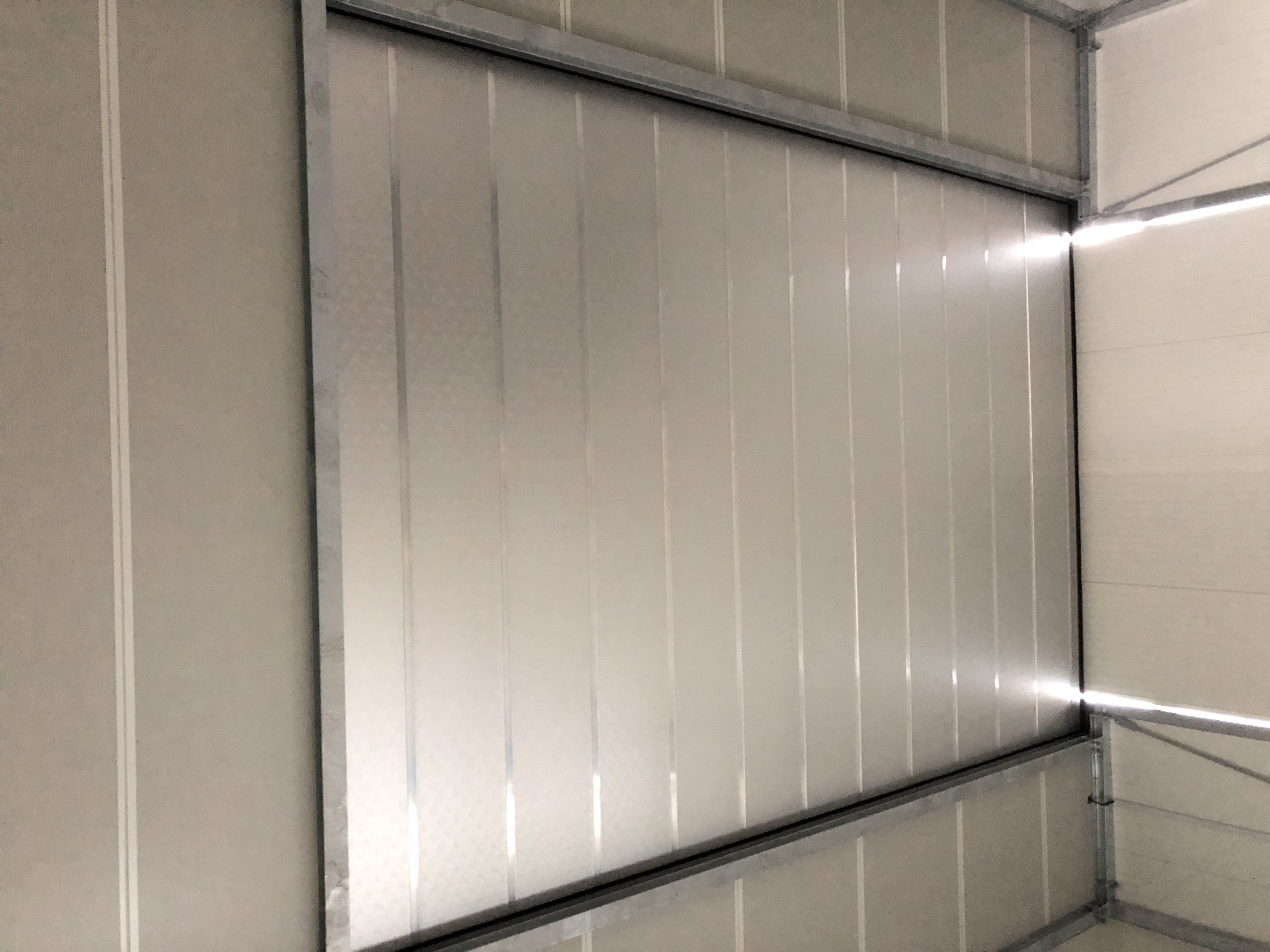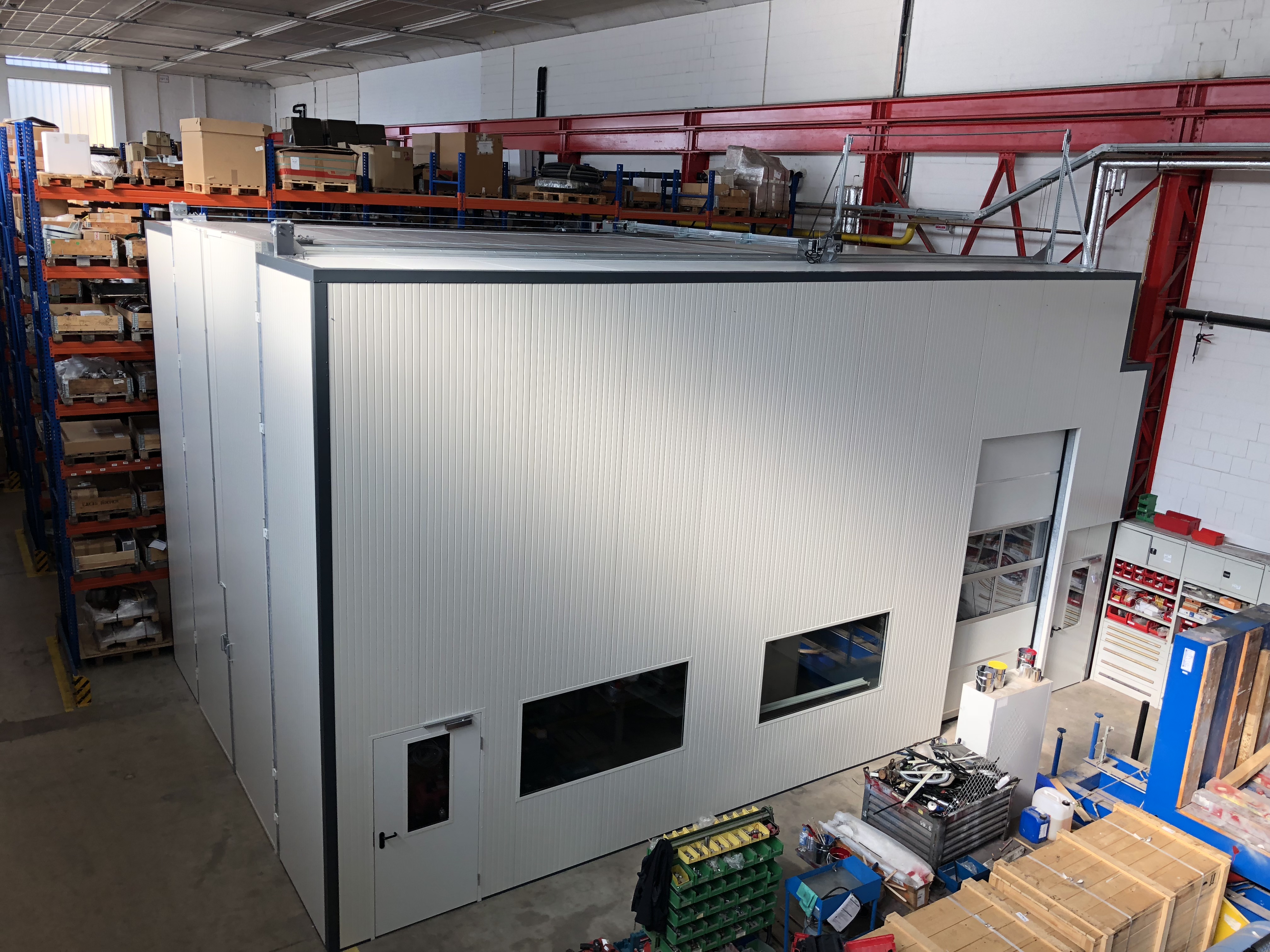 Die beiden Segmente sind durch eine Trennwand mit Sichtfenstern und einer Fluchttür voneinander getrennt. Die Wandpaneele bestehen aus zwei Metalldeckschalen mit thermisch isolierendem Polyurethan-Dämmkern. Die eingesetzten Schallschutz-Deckenelemente erreichen durch die 60 mm Mineralwolldämmung gute akustische und schalldämmende Eigenschaften.
