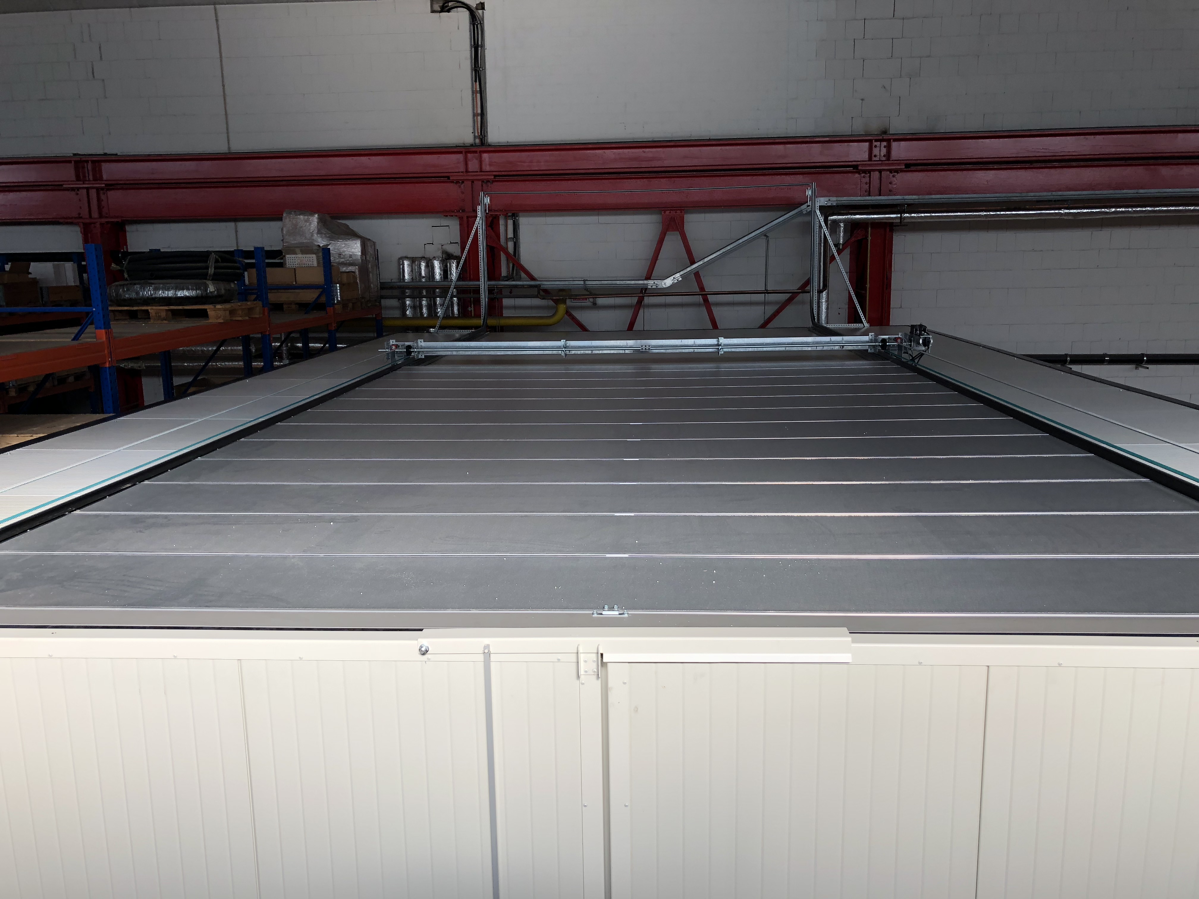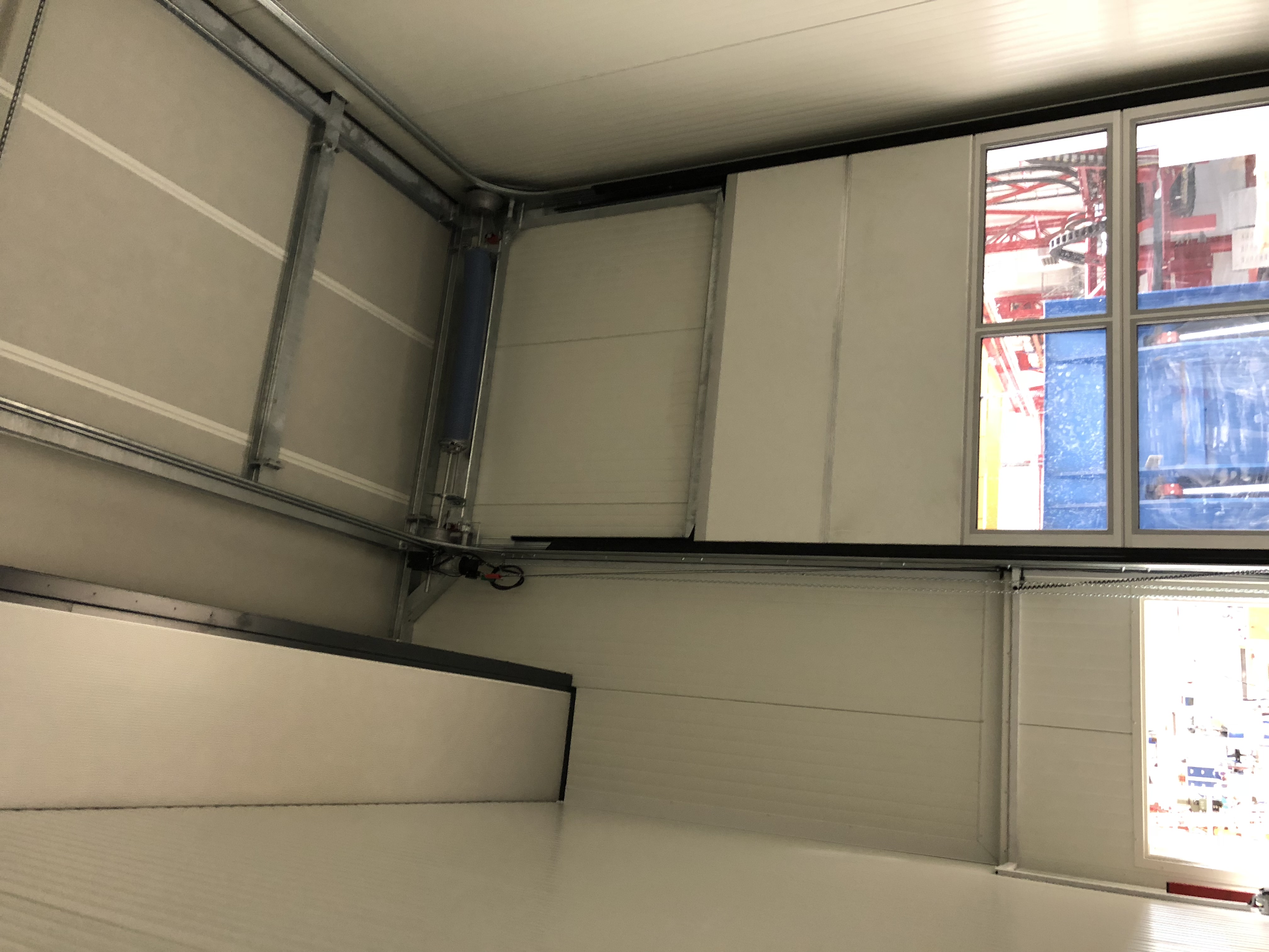 Aufgrund der großen Drehflügeltür (3,50 m breit und 6,00 m hoch) ohne Anschlag im oberen Bereich und einem auf dem Dach eingebauten Sektionaltores mit horizontaler Laufrichtung, kann der vorhandene Hallenkran weiterhin genutzt werden, um große und hängende Bauteile seitlich in den Messraum einzubringen.