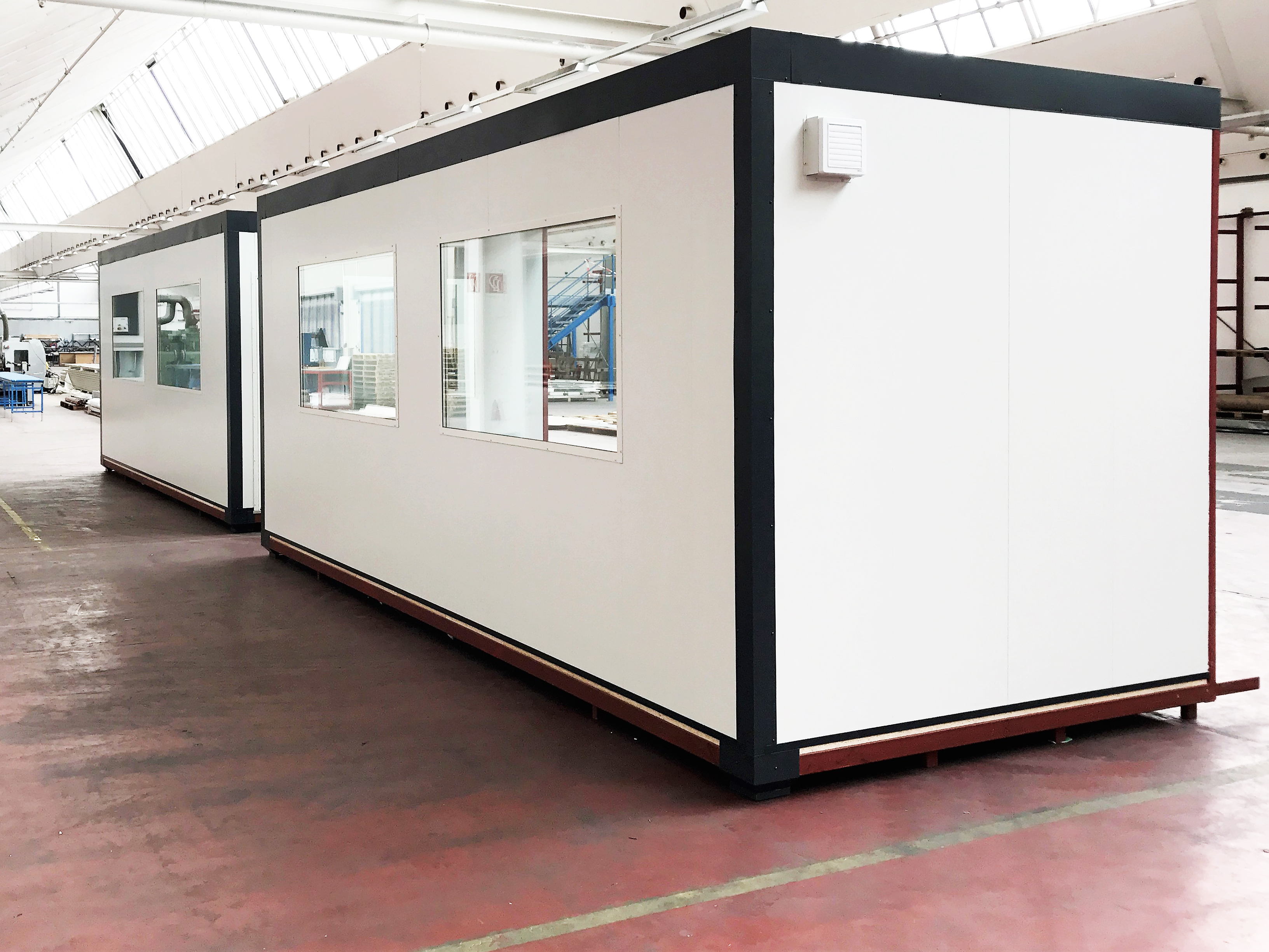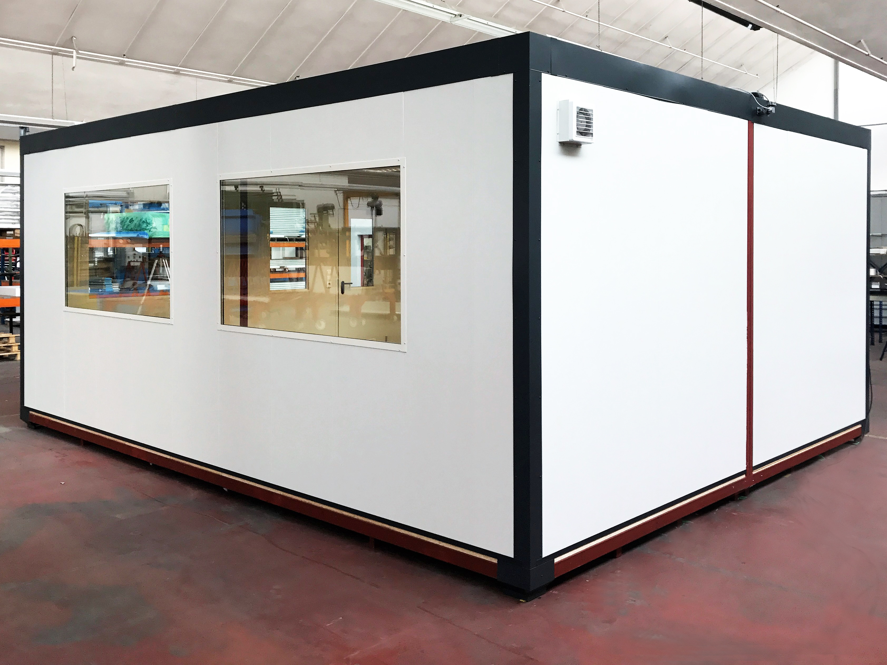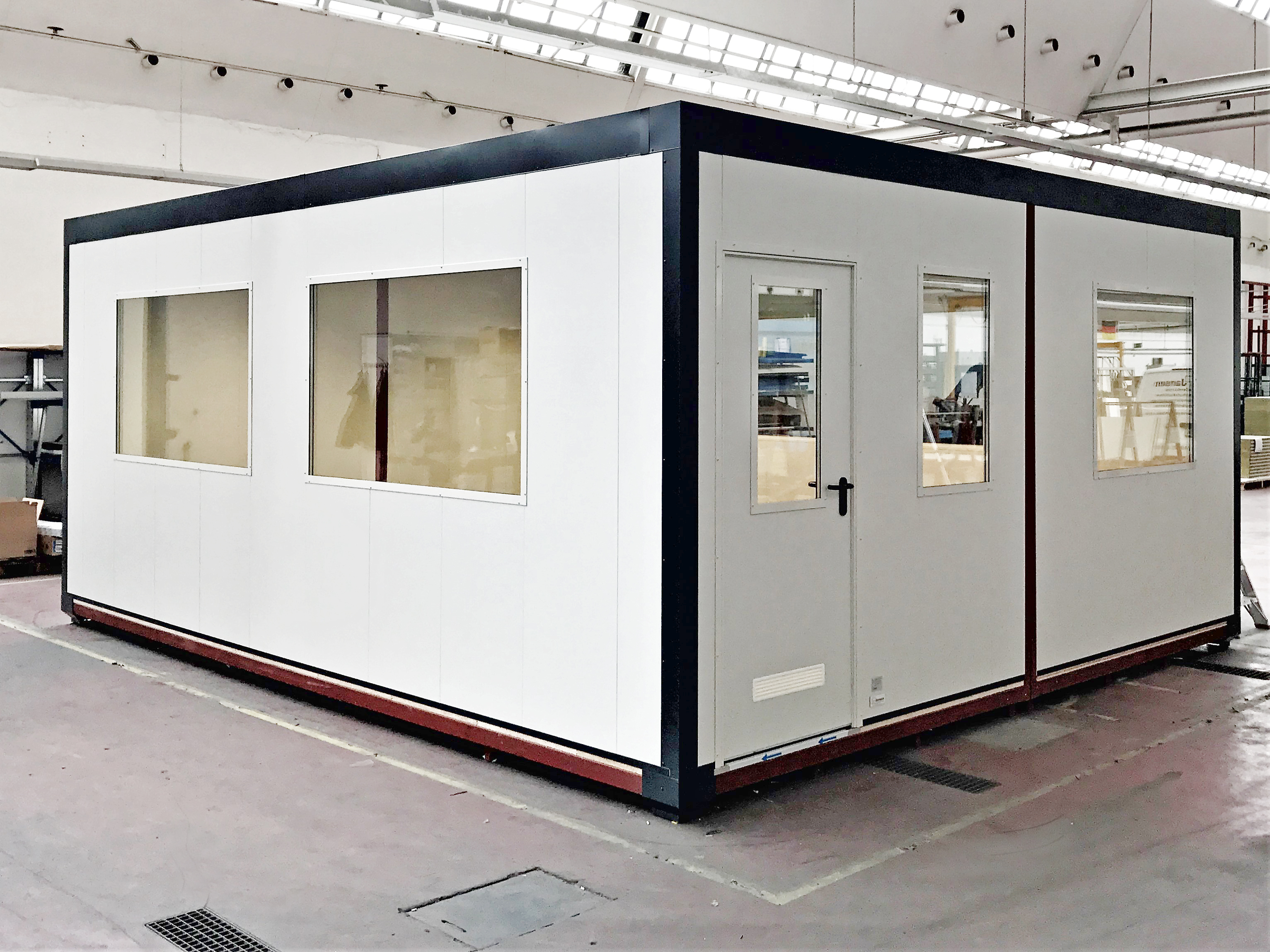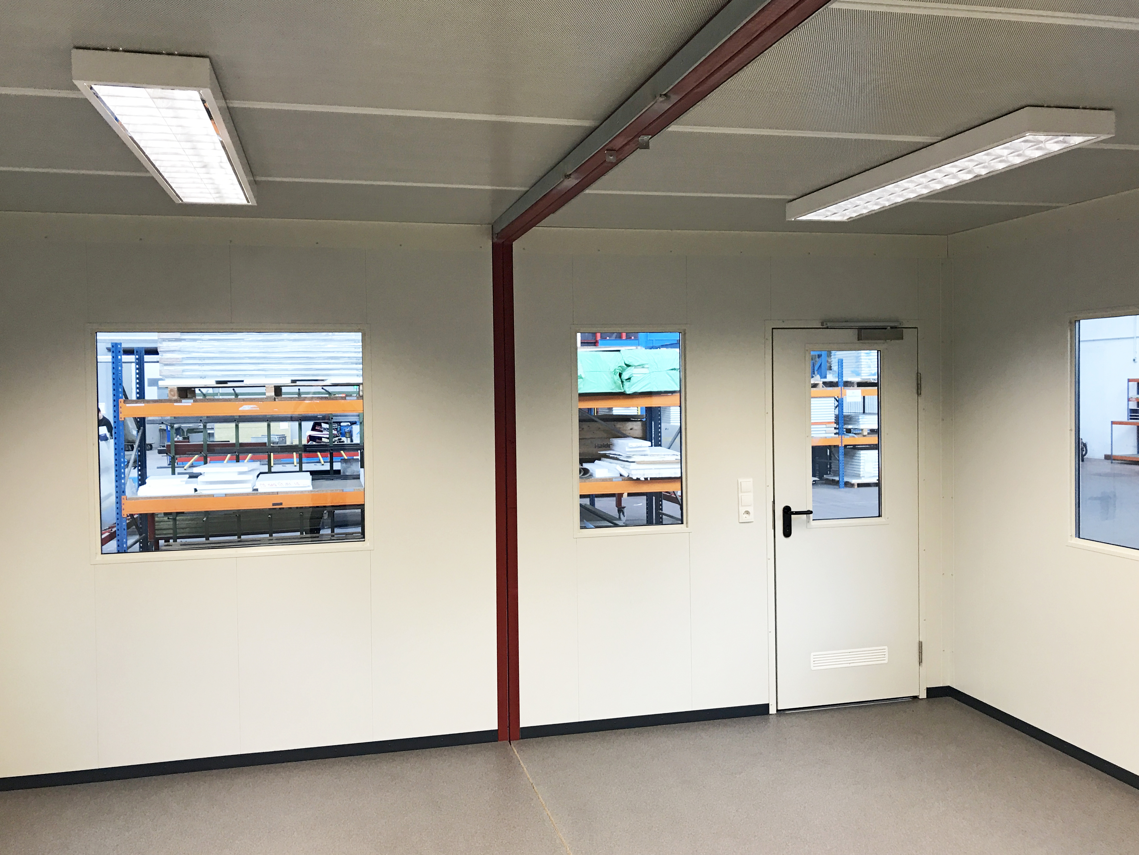 Das Hallenbüro besteht aus zwei werksseitig vorgefertigten Einheiten, die in unserem Hause komplett ausgestattet und elektrisch verdrahtet wurden. Die beiden Einheiten lassen sich Vorort leicht zusammensetzen, sodass keinerlei baulichen Störungen oder Unterbrechungen der Produktion beim Kunden verursacht werden.
