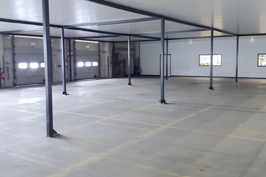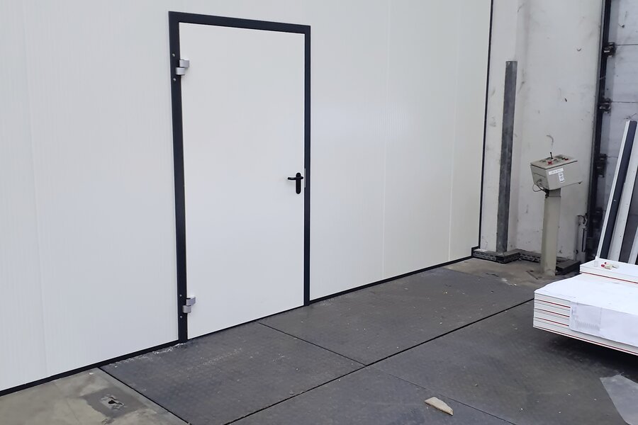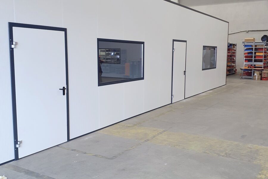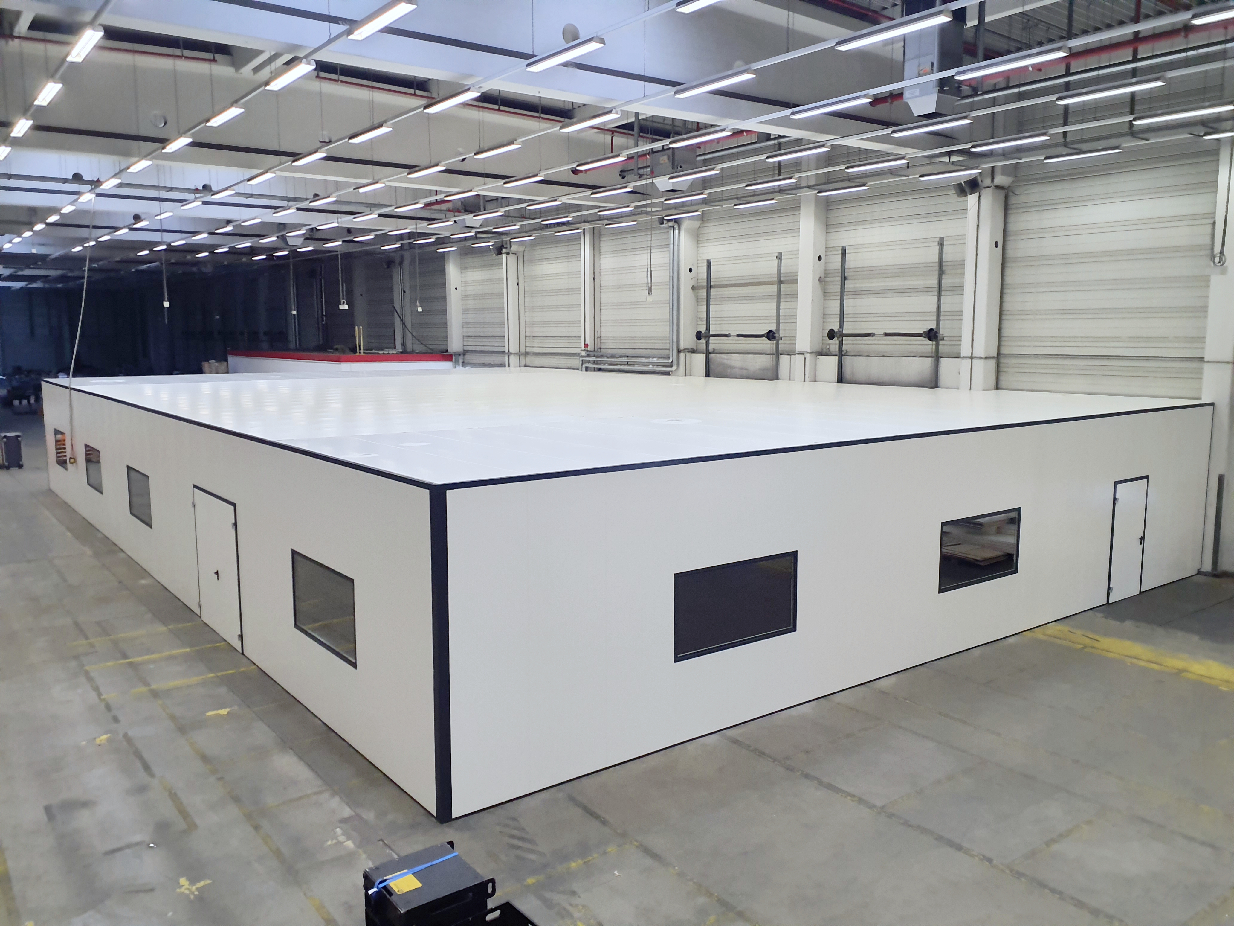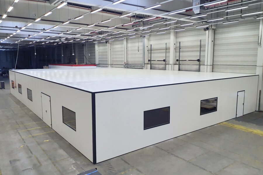 Der neue Halleneinbau misst 26 mal 16 Meter bei einer Deckenhöhe von 3,20 Meter. Die 60 Millimeter starken Wand- und Deckenelemente bestehen aus zwei Metalldeckschichten mit innen liegendem Polyurethan-Dämmkern. Bei einem Luftschalldämmwert von 25 Dezibel isolieren die Paneele den in der Werkstatt entstehenden Lärm umfassend.