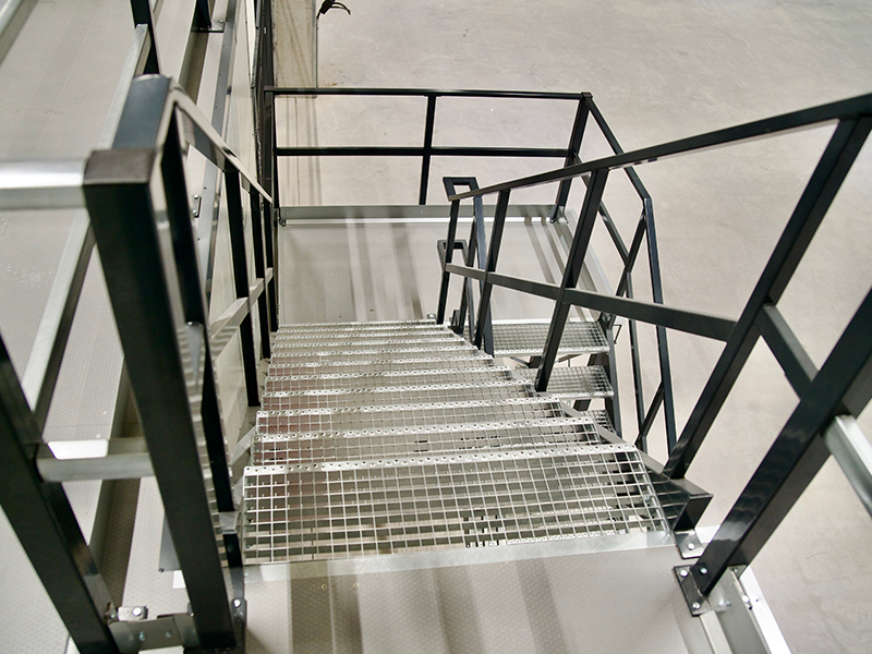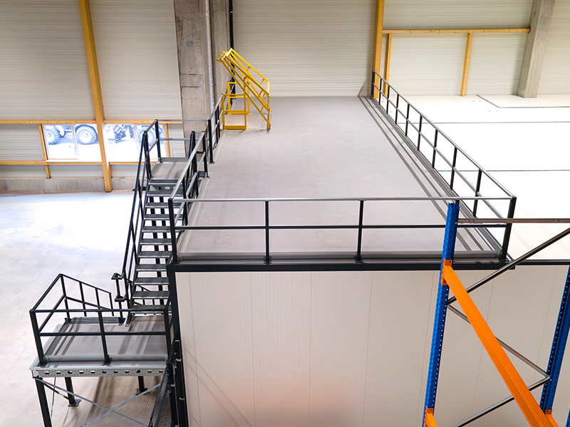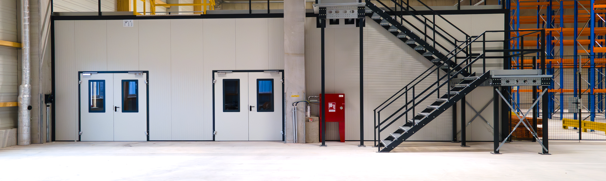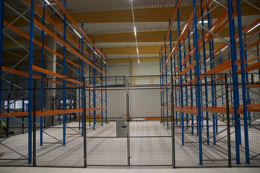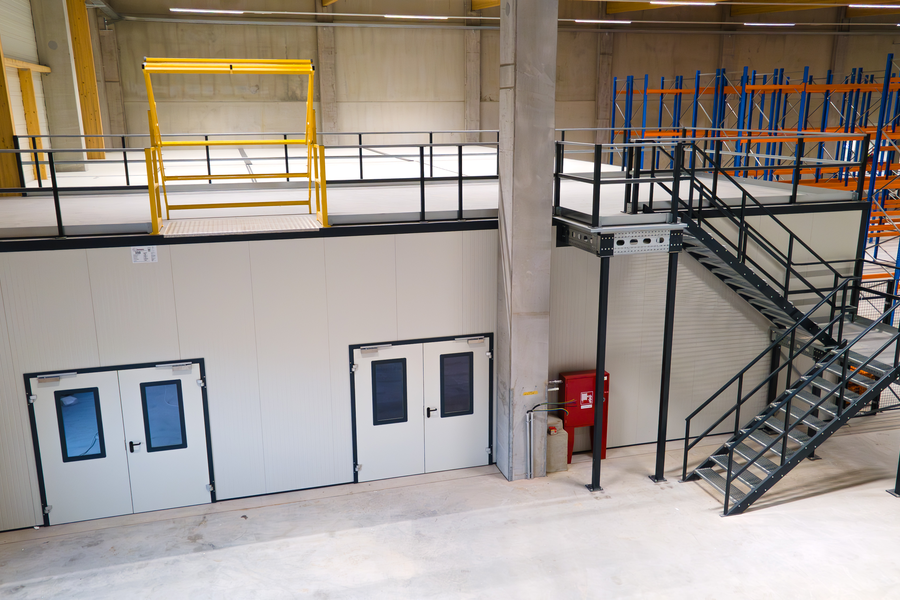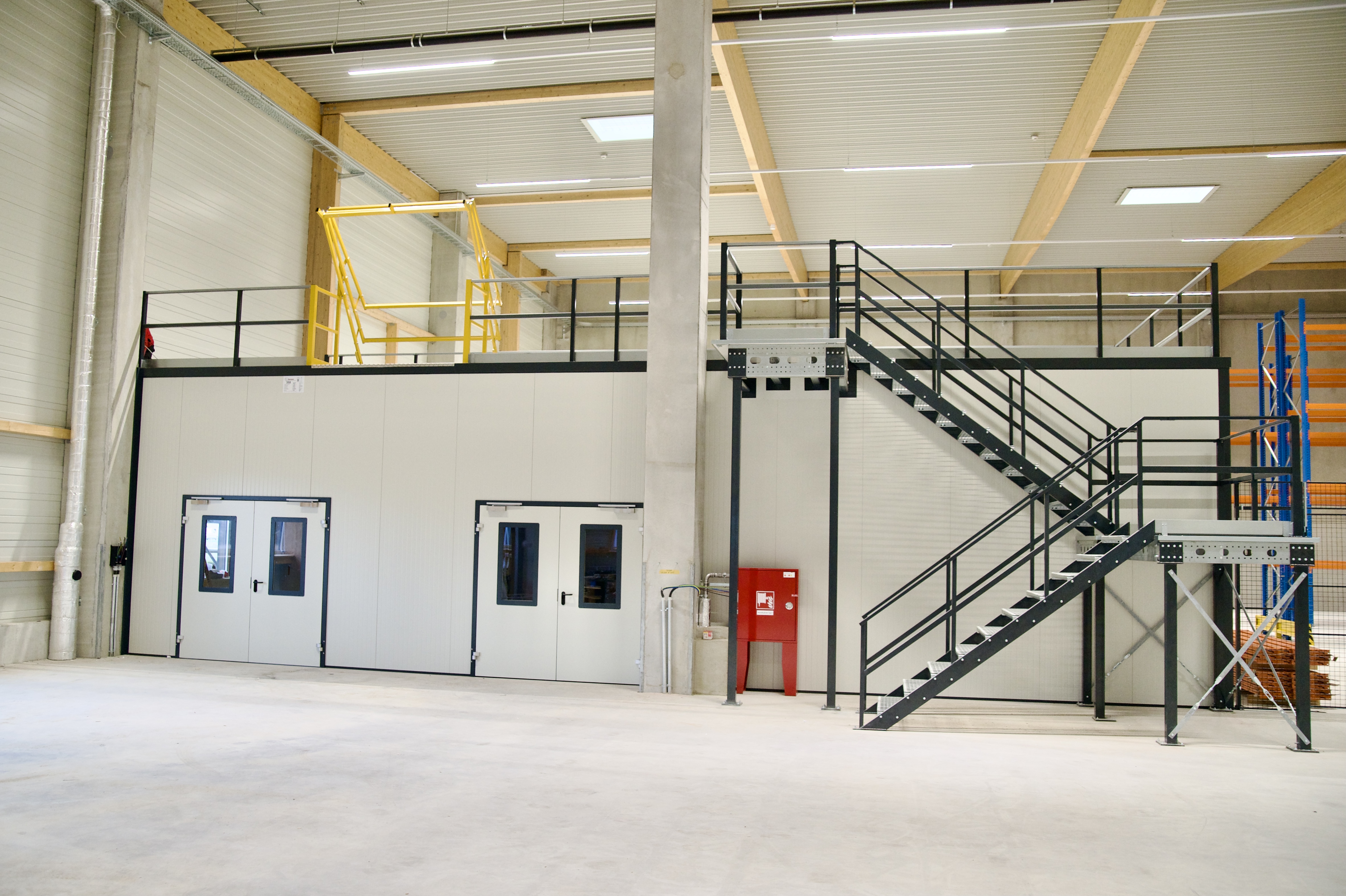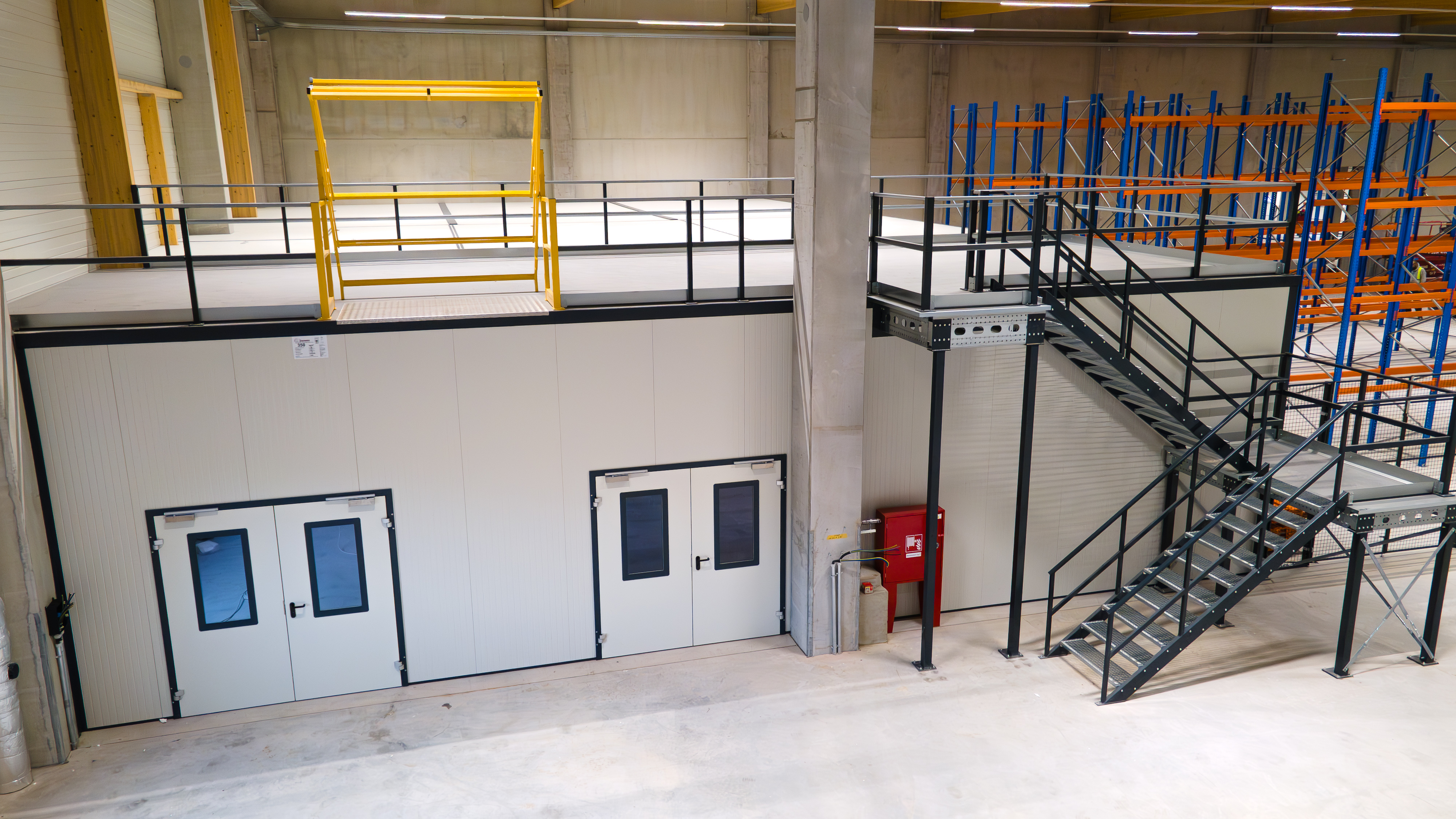 Herzstück des Projekts ist ein großzügiger Modulraum mit einer Grundfläche von 21,63 x 14,48 m und einer Raumhöhe von 3,89 m, welcher zweiseitig an die Hallenfassade angebunden wurde. Die Raumstruktur basiert auf Schallschutzpaneelen und bietet eine flexible Aufteilung im Erdgeschoss: Hier befinden sich separate Bereiche für Verpackung, Prüfzentrum, Lager, Sanitätsraum und weitere Räumlichkeiten. Das Obergeschoss wurde mit einer vollintegrierten Lagerbühne mit den Maßen 14,48 x 5,65 x 3,89 m teilüberbaut. Eine Schwenkschleuse sorgt für sichere Materialflüsse zwischen den Ebenen. Direkt angrenzend wurde ein durch eine Gittertrennwand gesicherter Hochregalbereich geschaffen, der eine sichere und übersichtliche Lagerung ermöglicht.