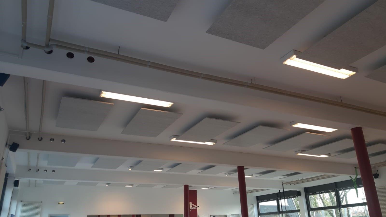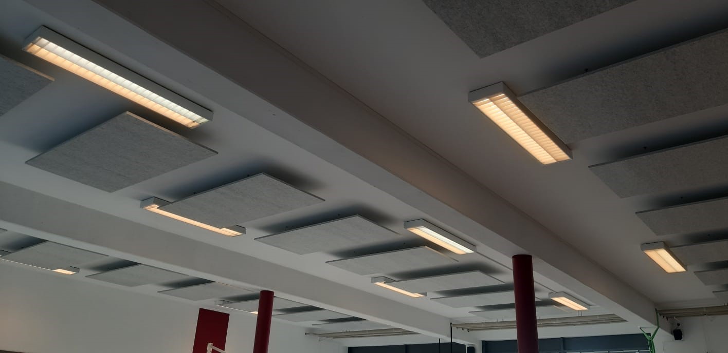 Zur Verbesserung der Akustik wurden über 60m² Akustikdeckensegel im Studio installiert und eine Nachhallzeit nach Empfehlung der DIN 18041 erreicht.