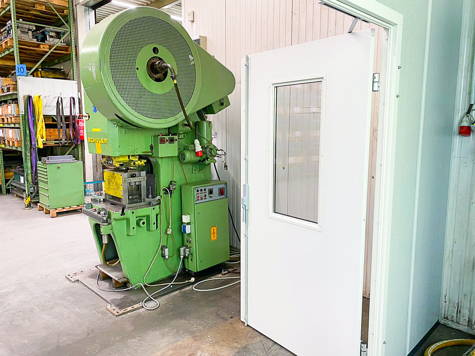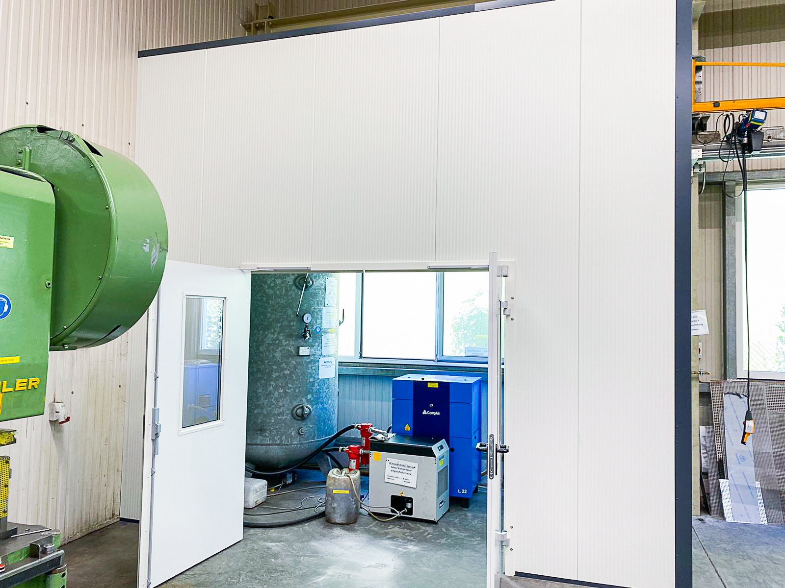 Der ca. 11 m² große Schallschutzraum mit einer Höhe von 4 m bereichert nun die Fertigungshallen des Familienunternehmens. Die 60 mm schallabsorbierenden Wand- und Deckenpaneele mit Mineralwoll-Dämmkern sind nicht brennbar. Für einen ausreichend dimensionierten und barrierefreien Zugang in den Schallschutzraum sorgt eine ebenerdig eingebaute Doppelflügeltür.