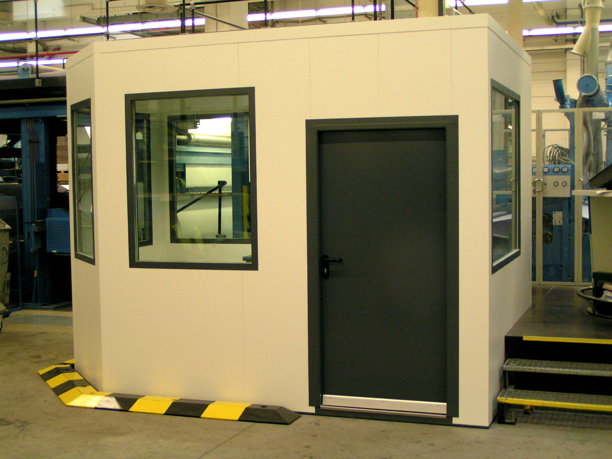 Schallschutzkabinen von Jansen Systembau eignen sich als lärmreduzierte Räume z.B. Meisterbüros, Pausenräume oder Schaltwarten z.B. in Industrie- und Gewerbehallen. Die Kabinen können in verschiedenen Farben hergestellt werden.