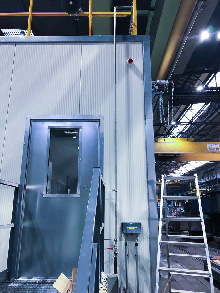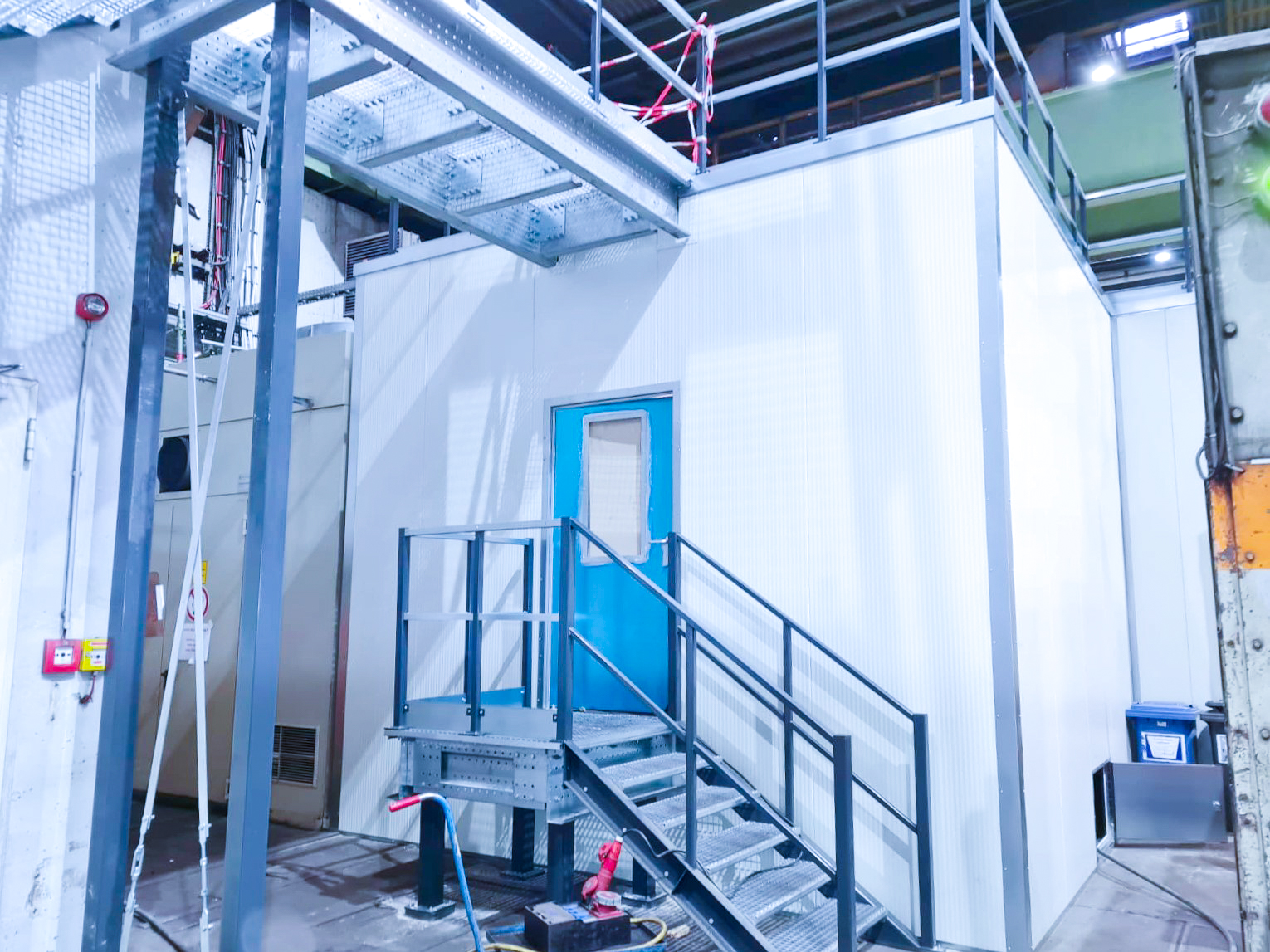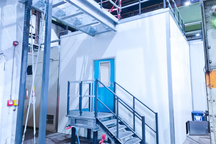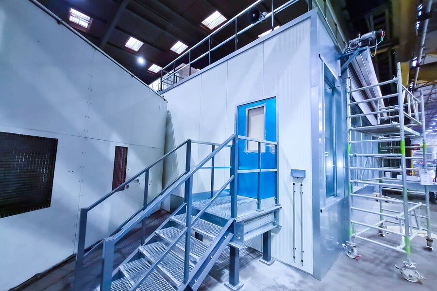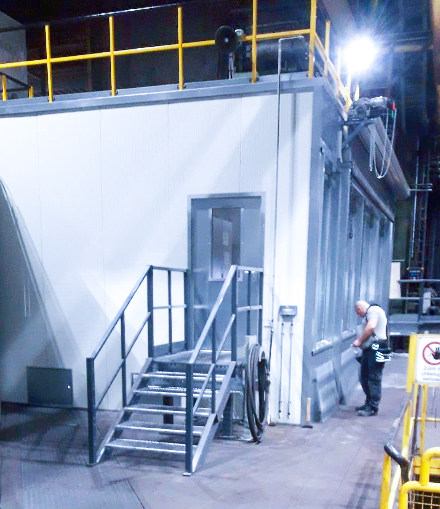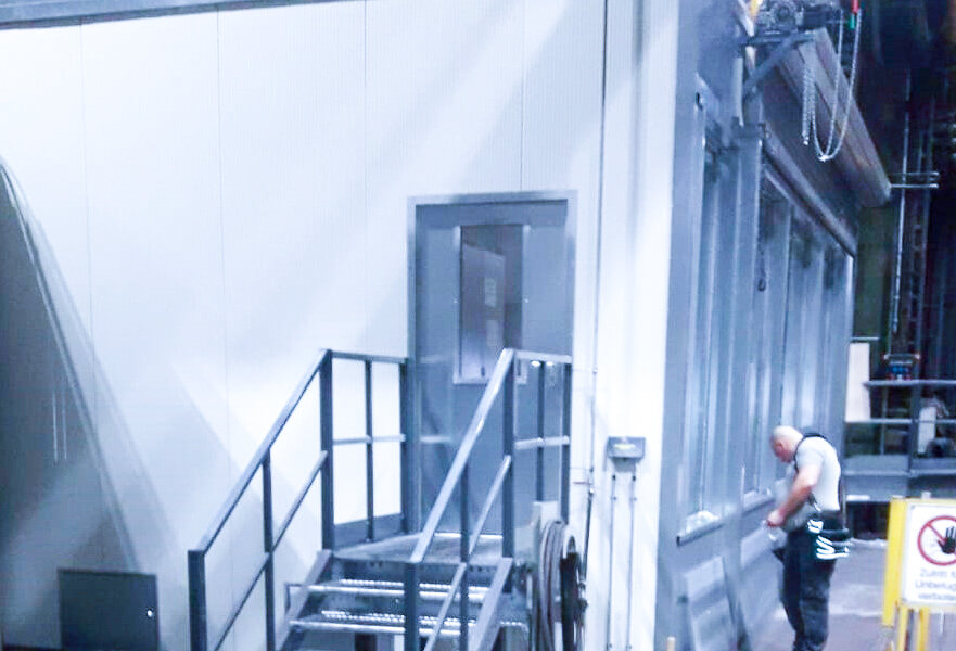 Um dem Wunsch des Rundumblicks zu entsprechen, errichteten wir den neuen Steuerstand auf einem Stahlpodest in einem Meter Höhe. Durch das 500 Kilogramm große Steuerpult, die Anlagenschränke und die Sonderverglasung an der Front ist der 90 Quadratmeter große Raum ein echtes Schwergewicht. Um das zu stemmen, setzten wir eine Schwerlastbühne mit einer Tragkraft von 1400 Kilogramm pro Quadratmeter ein.
