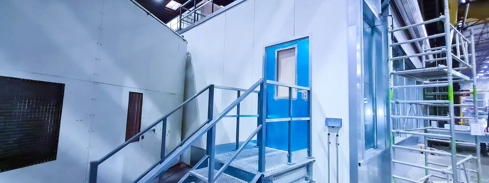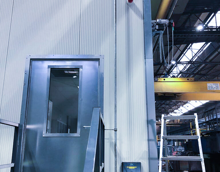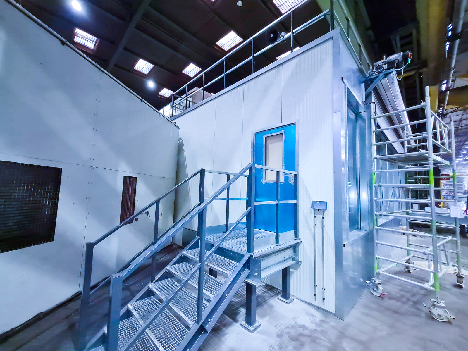 Die Sonderverglasung aus wärmereflektierender Beschichtung ist bis zu 120 Grad temperaturbeständig und besteht aus Sicherheitsglas mit Splitterbindung. Damit wir diese Sonderverglasung aufnehmen, aussteifen und absichern konnten, setzten wir sowohl Stahlbau-Hohlprofile als auch Konstruktionsbleche und Mineralwoll-Paneele ein. Ein Schwerlast Roboter brachte die neun Quadratmeter großen Scheiben in die richtige Position. Unser Hitzeschutz-Rolltor schützt die Verglasung im vorderen Bereich zusätzlich vor der extremen Hitze.