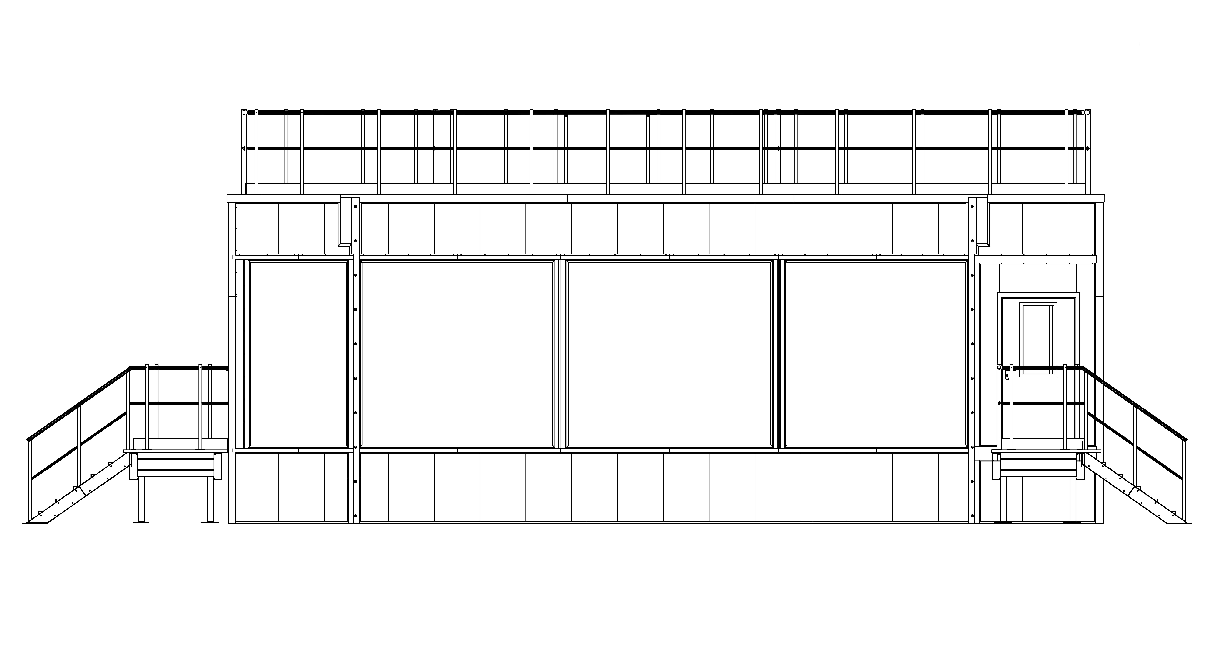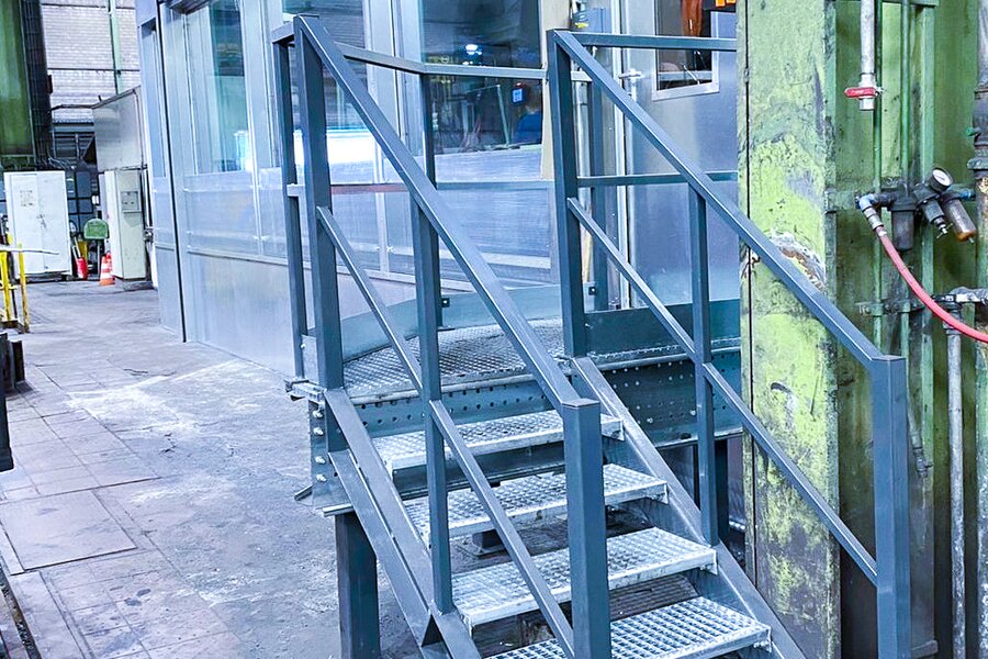 Oberhalb des Steuerstands in einer Höhe von über vier Metern installierten wir eine weitere Stahlbühne. Mit Tränenblechen ausgelegt, wird sie als Aussichtsplattform genutzt. Publikumsgeländer und eine große Zugangstreppe mit Zwischenpodest gehören selbstverständlich zum Lieferumfang. Mit der Stahlbühne im zweiten Obergeschoss ist bereits der Grundstein einer möglichen Erweiterung des Raumsystems gelegt.